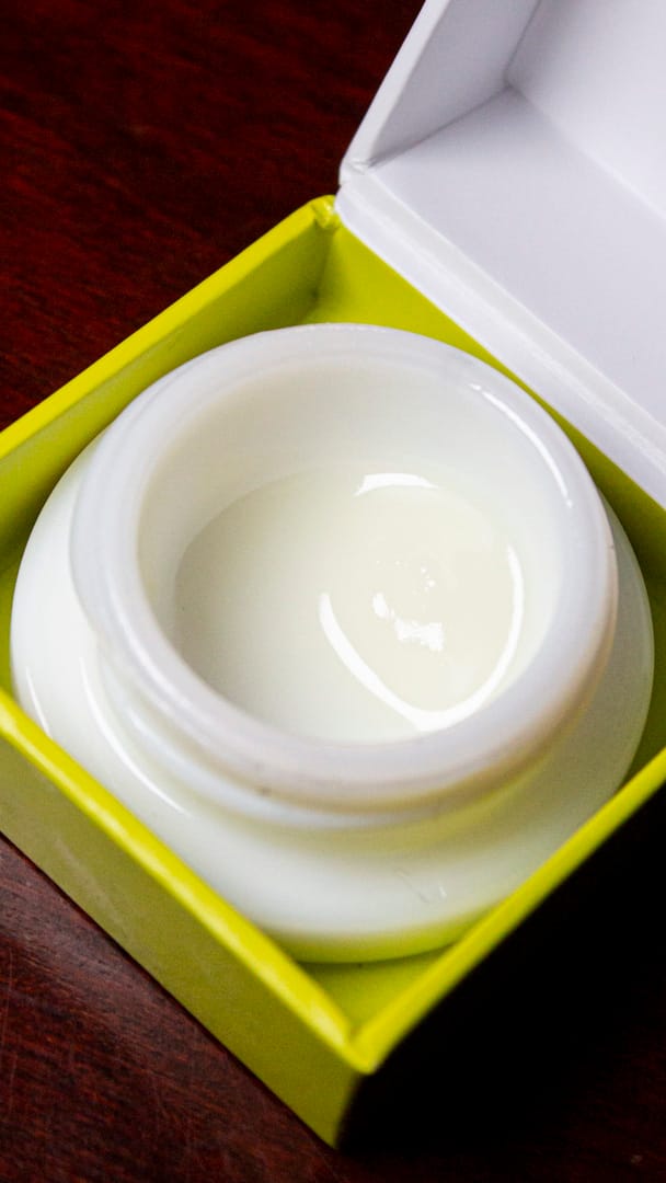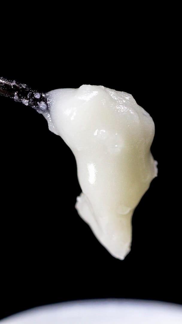 White with a tint of yellow, glassy wax with a wet appearance. Glossy, it scoops like a thick honey but holds structure for a bit before seperating.