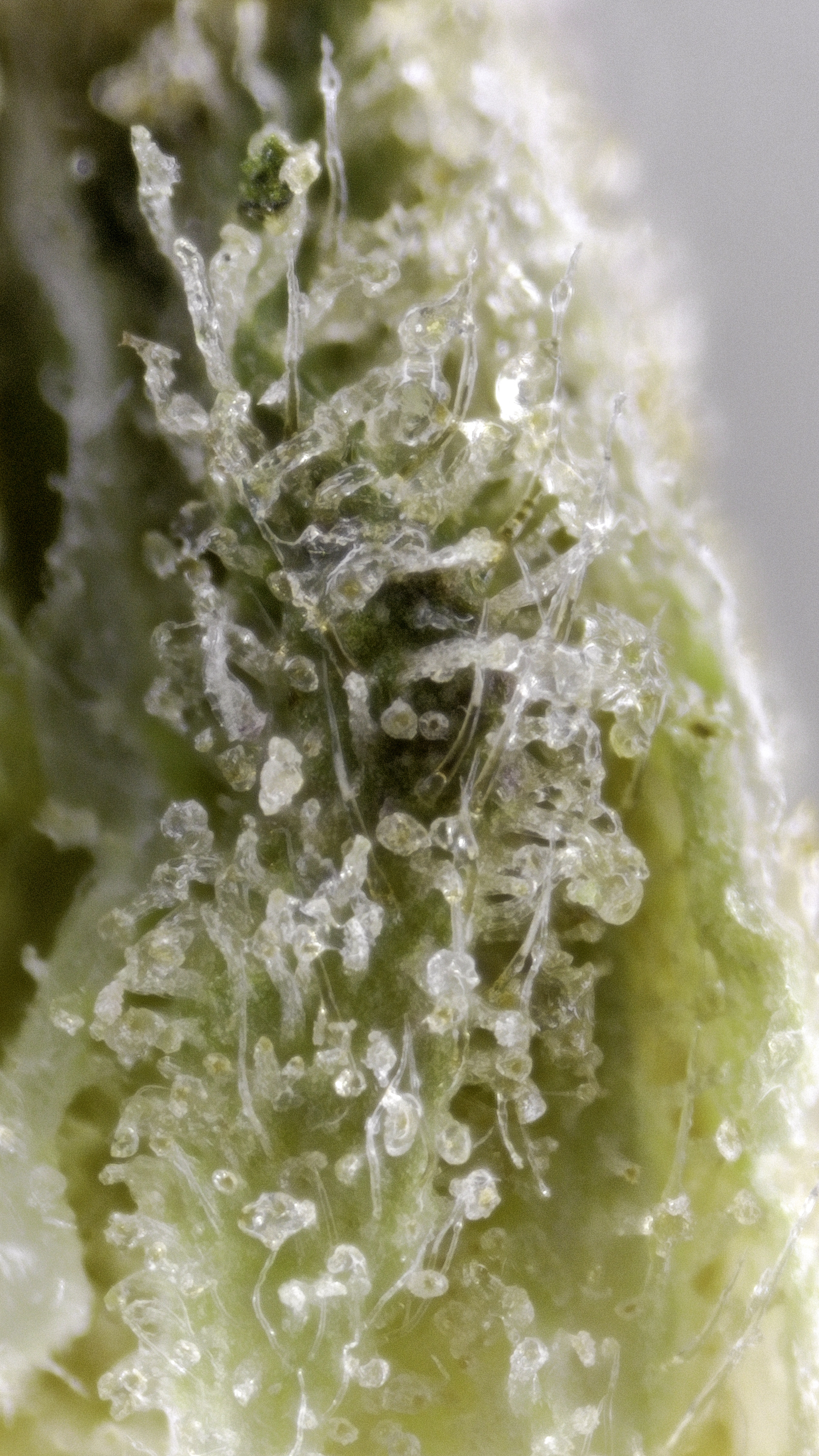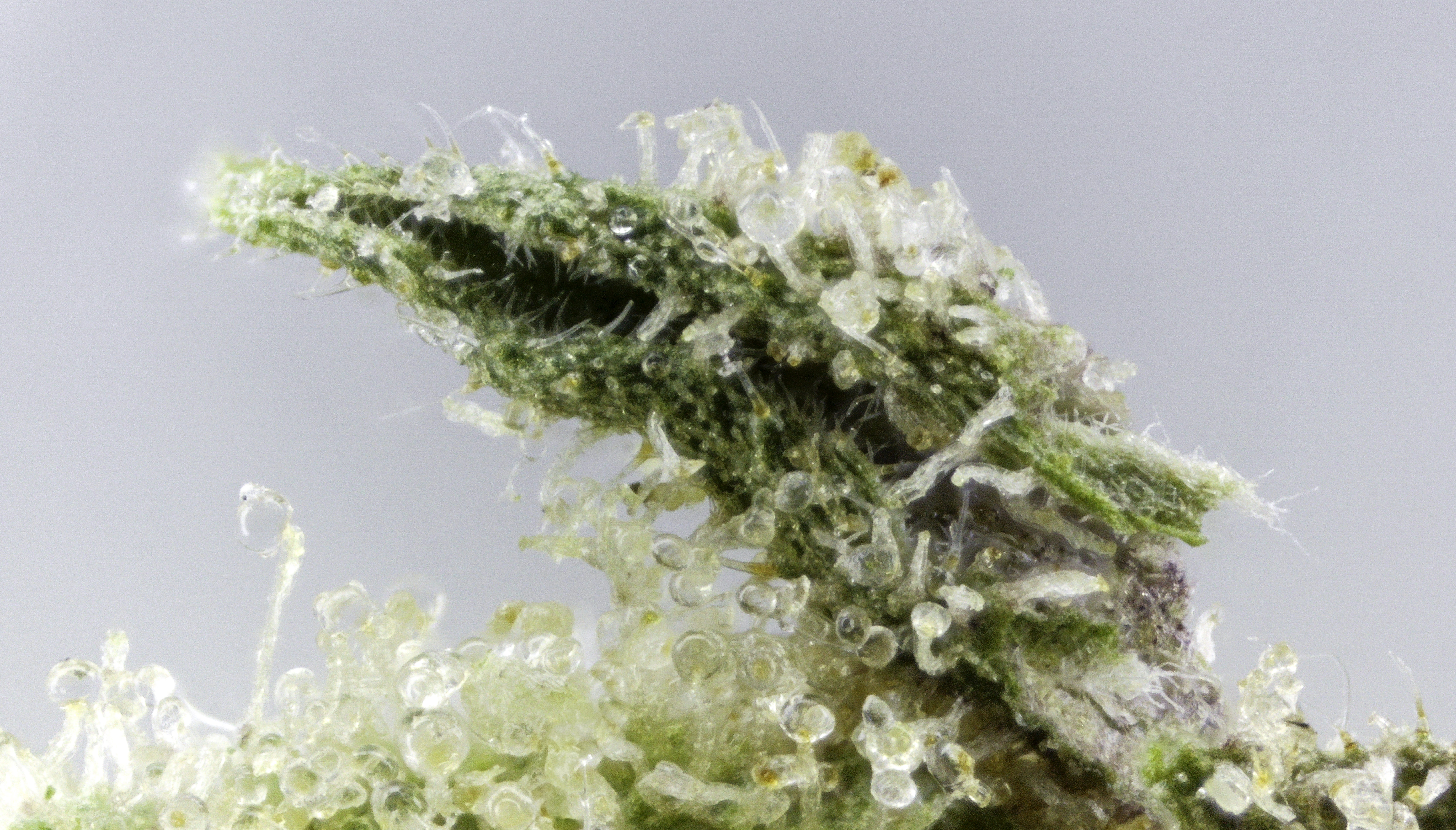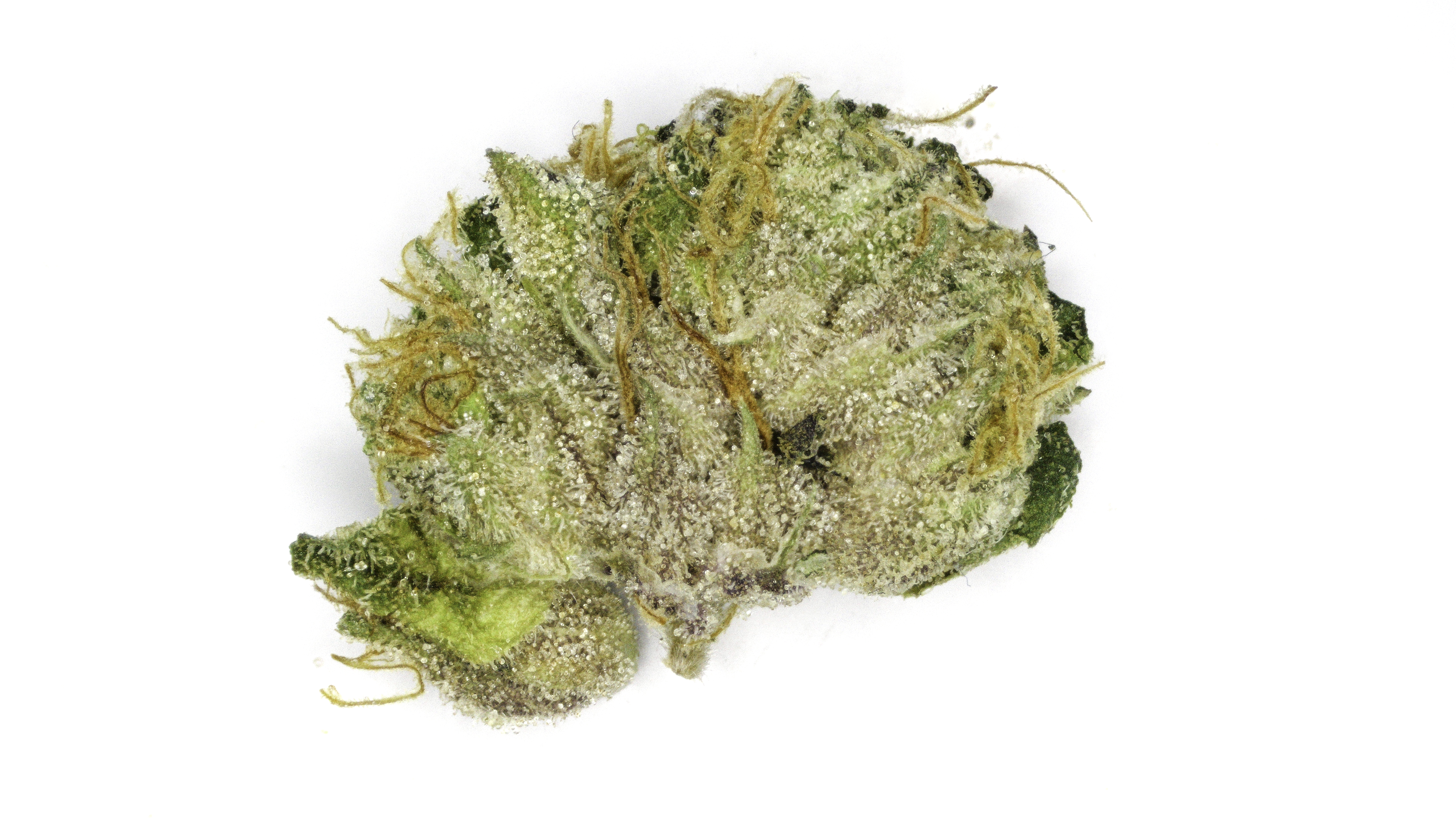 Chunky buds with a light lime green base, cream-colored pistils, and a glossy layer of crystal trichomes. Dense but not over-compressed, with some visible sugary stickiness when broken apart.