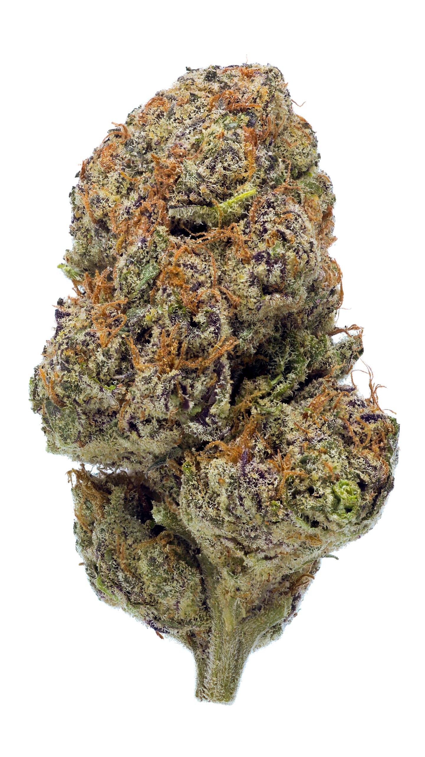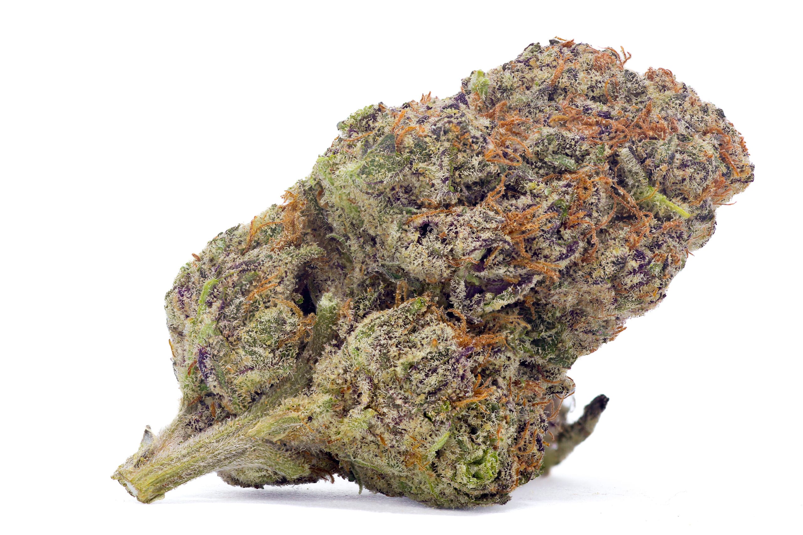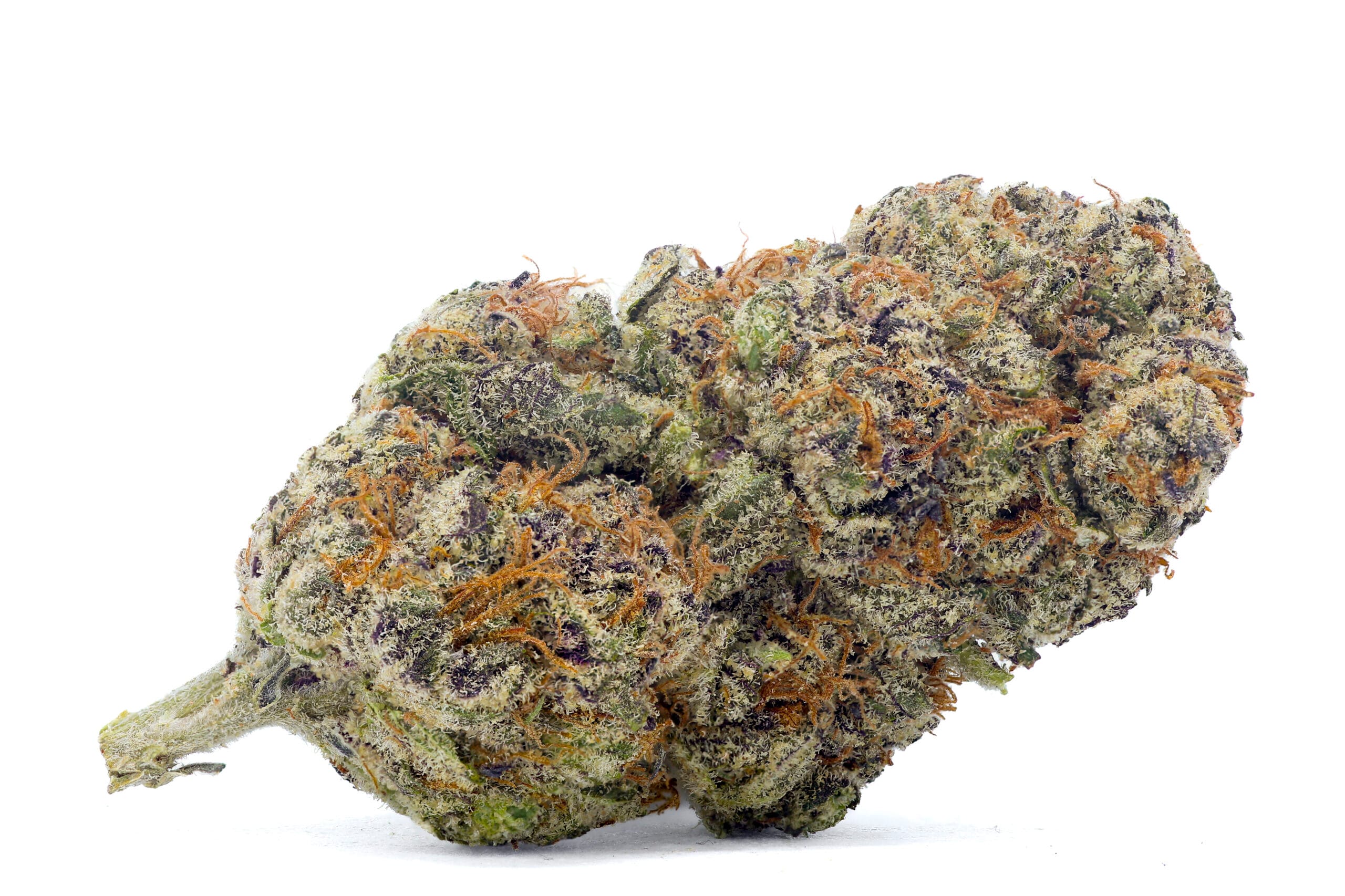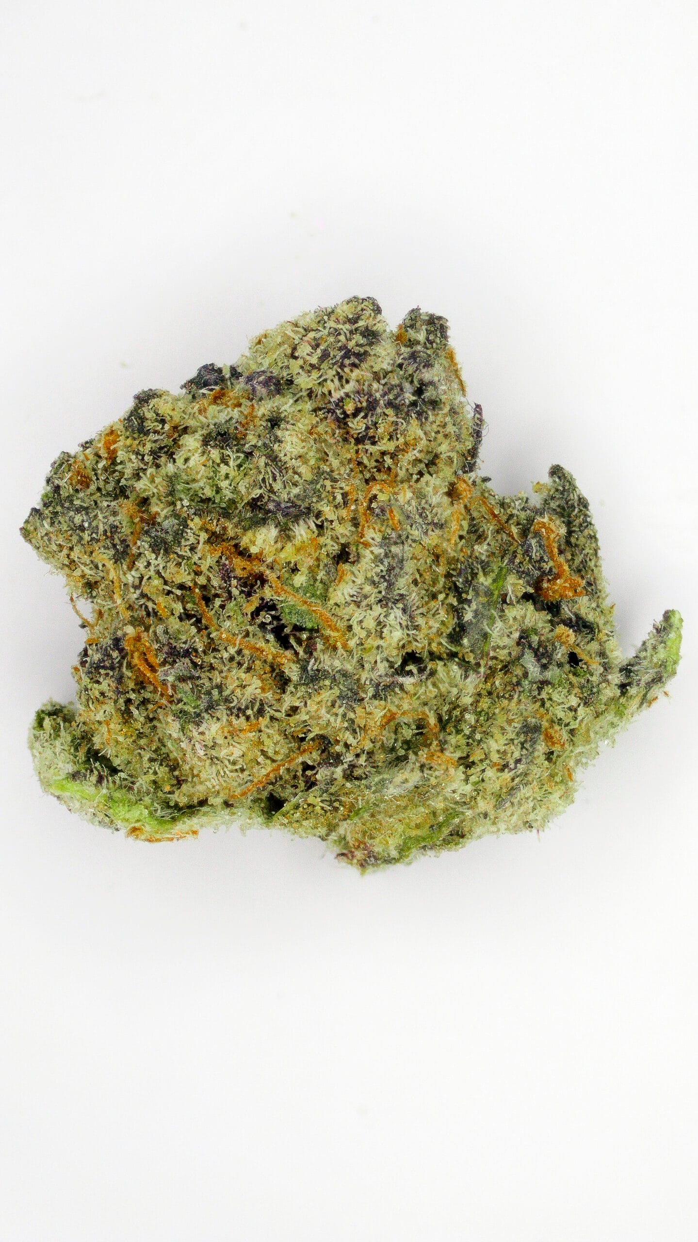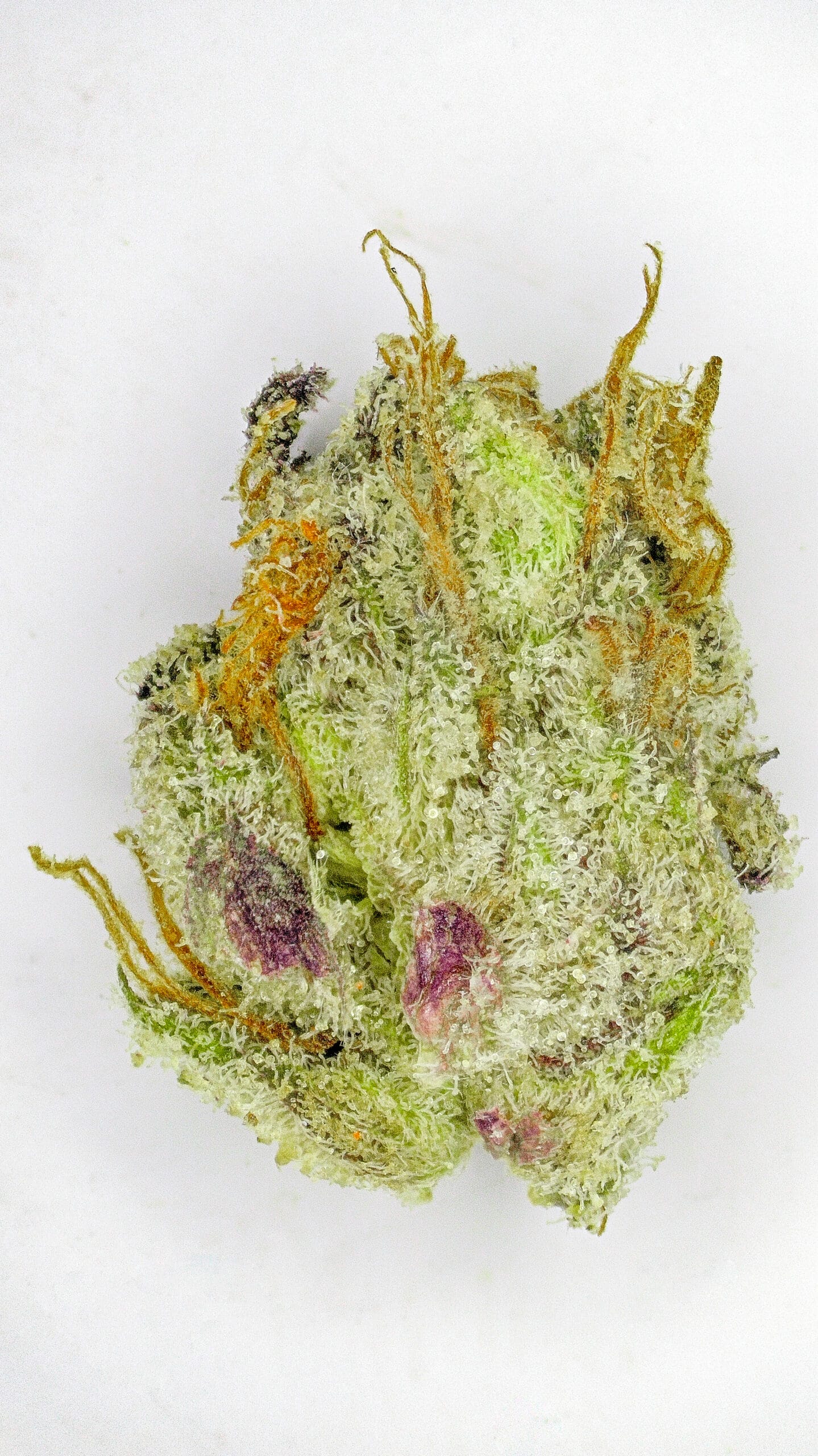 Dense, resin-coated nugs with dark forest-green tones, occasional purple accents, and a thick layer of sparkling trichomes—giving it a frosty “ice” look. It’s visually striking, even before you break it open.