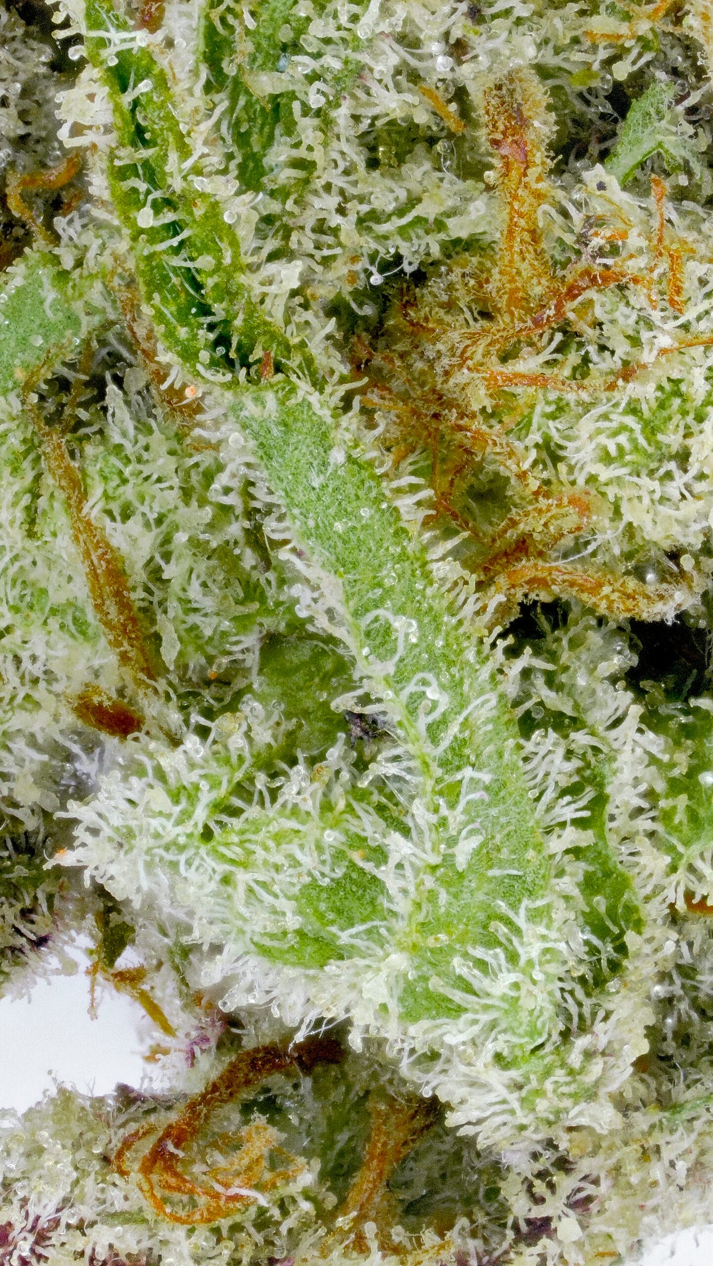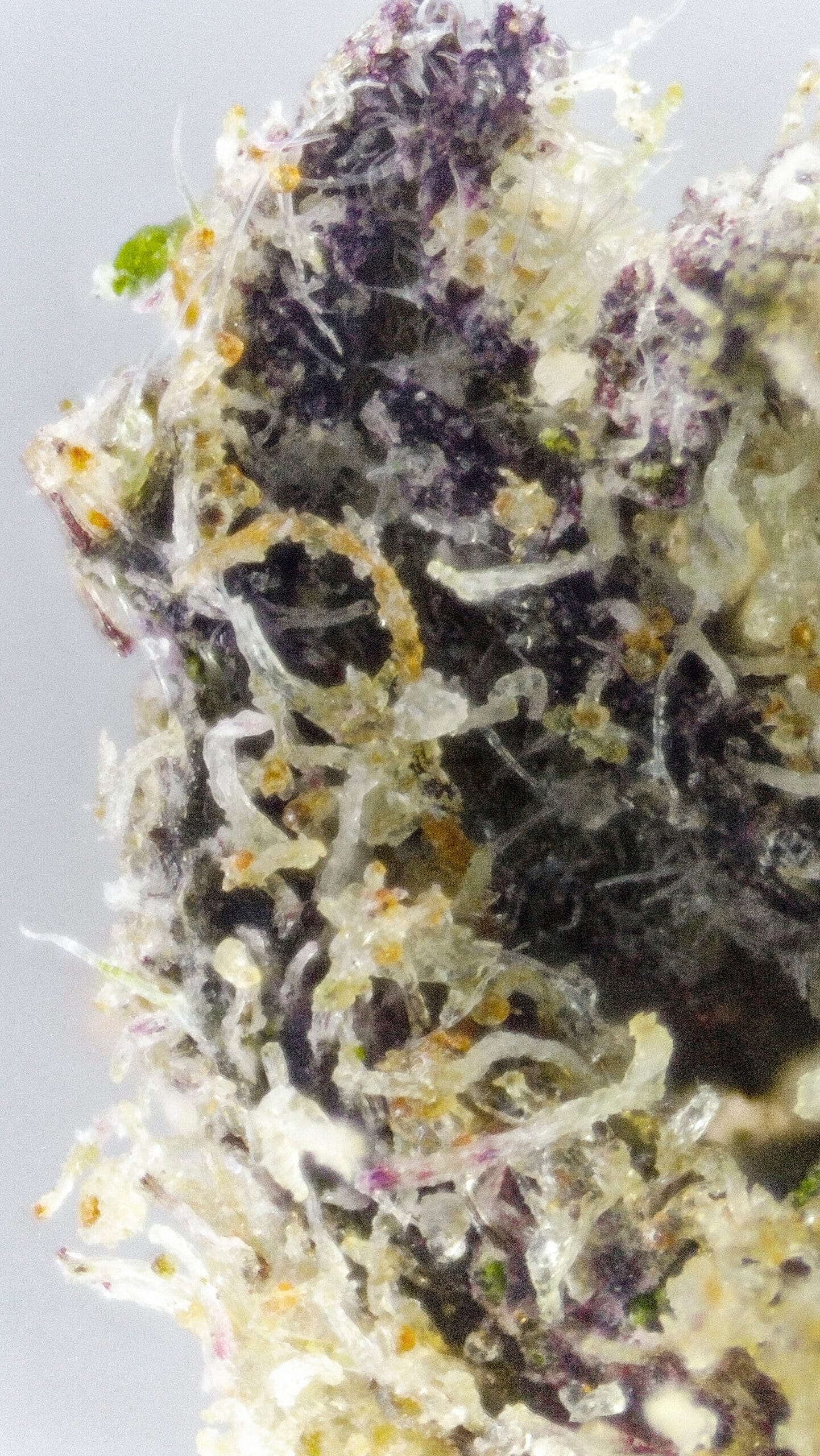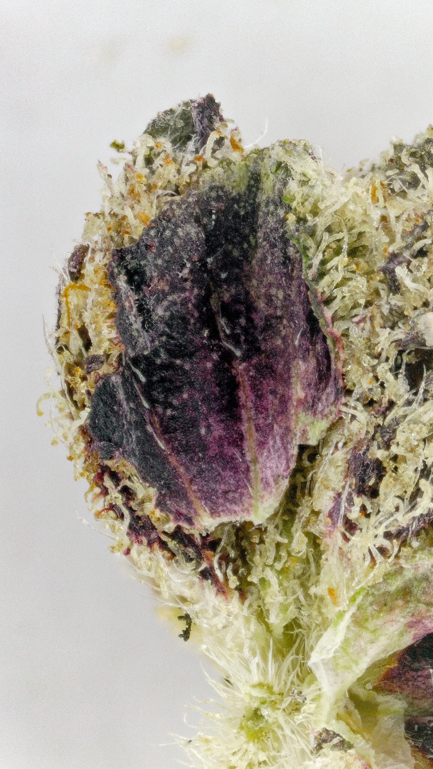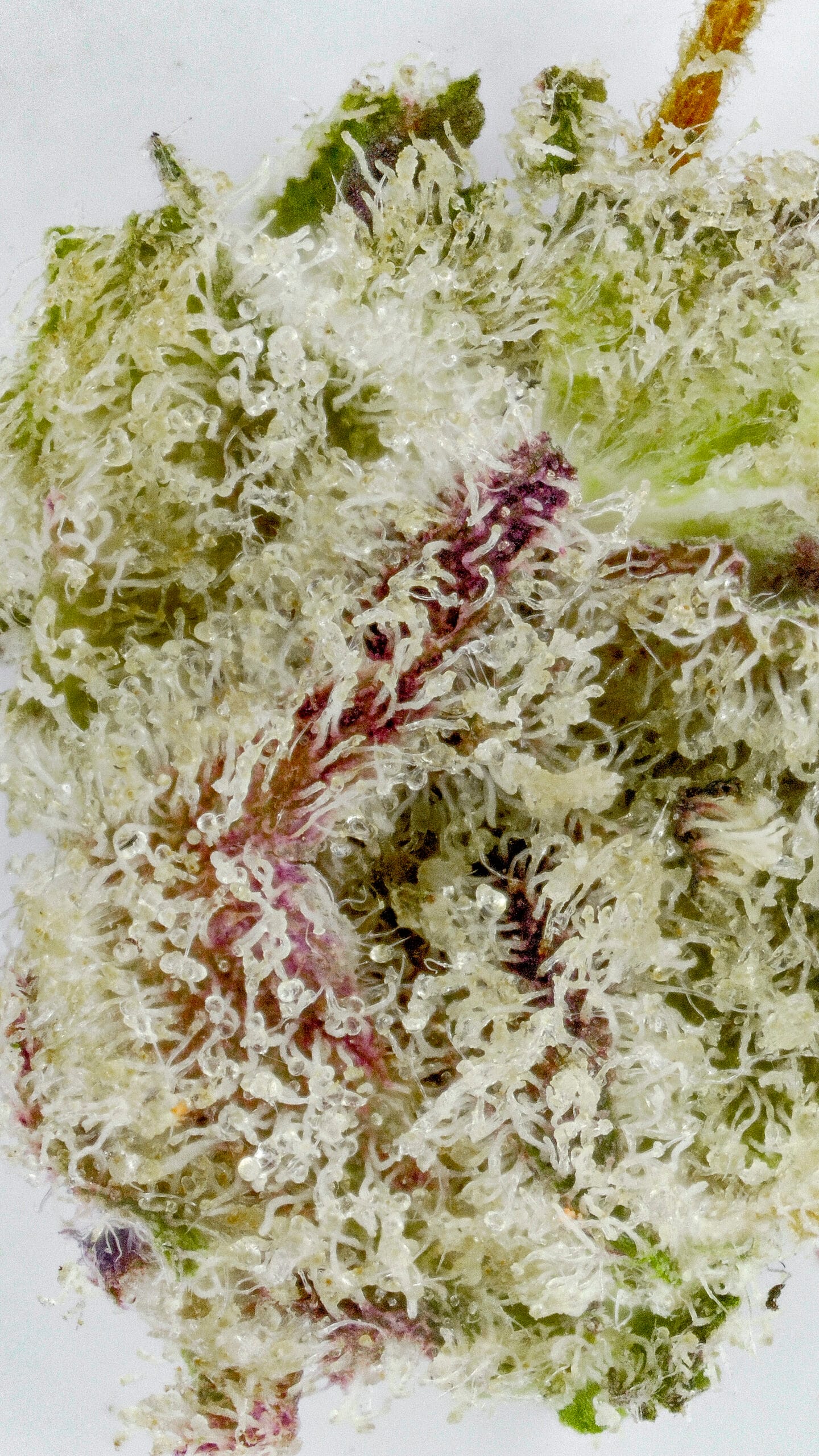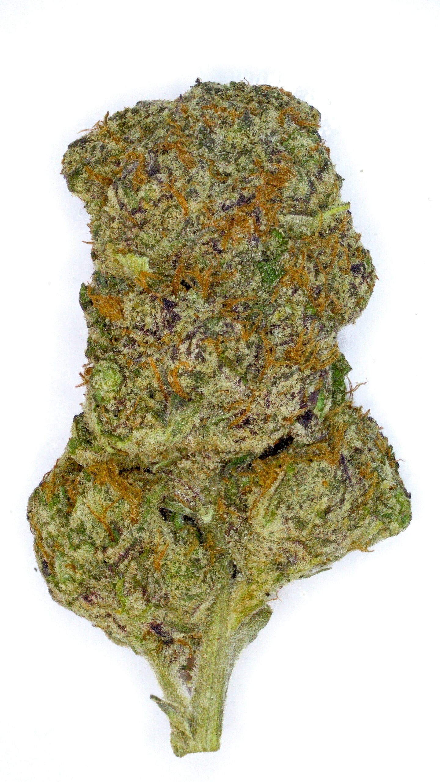Dense, resin-coated nugs with dark forest-green tones, occasional purple accents, and a thick layer of sparkling trichomes—giving it a frosty “ice” look. It’s visually striking, even before you break it open.