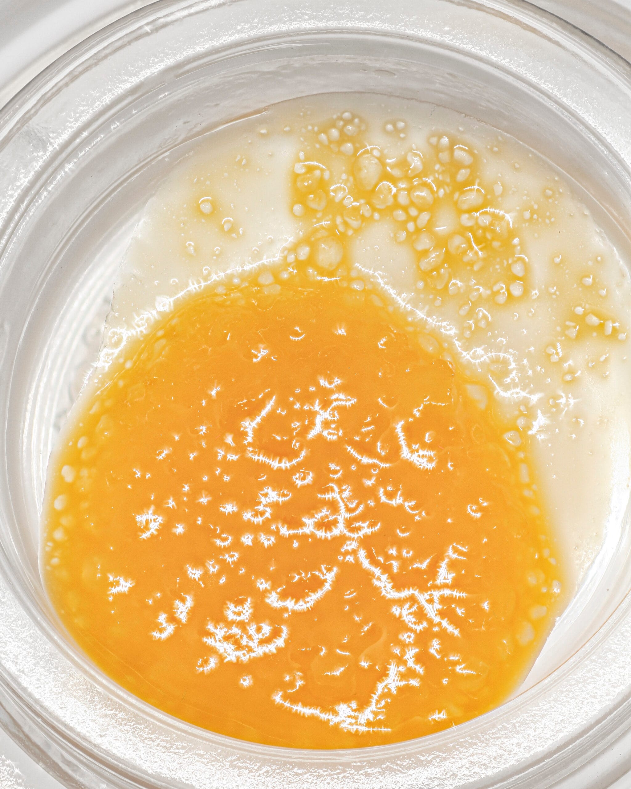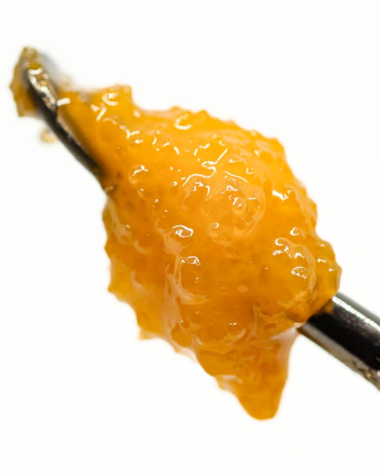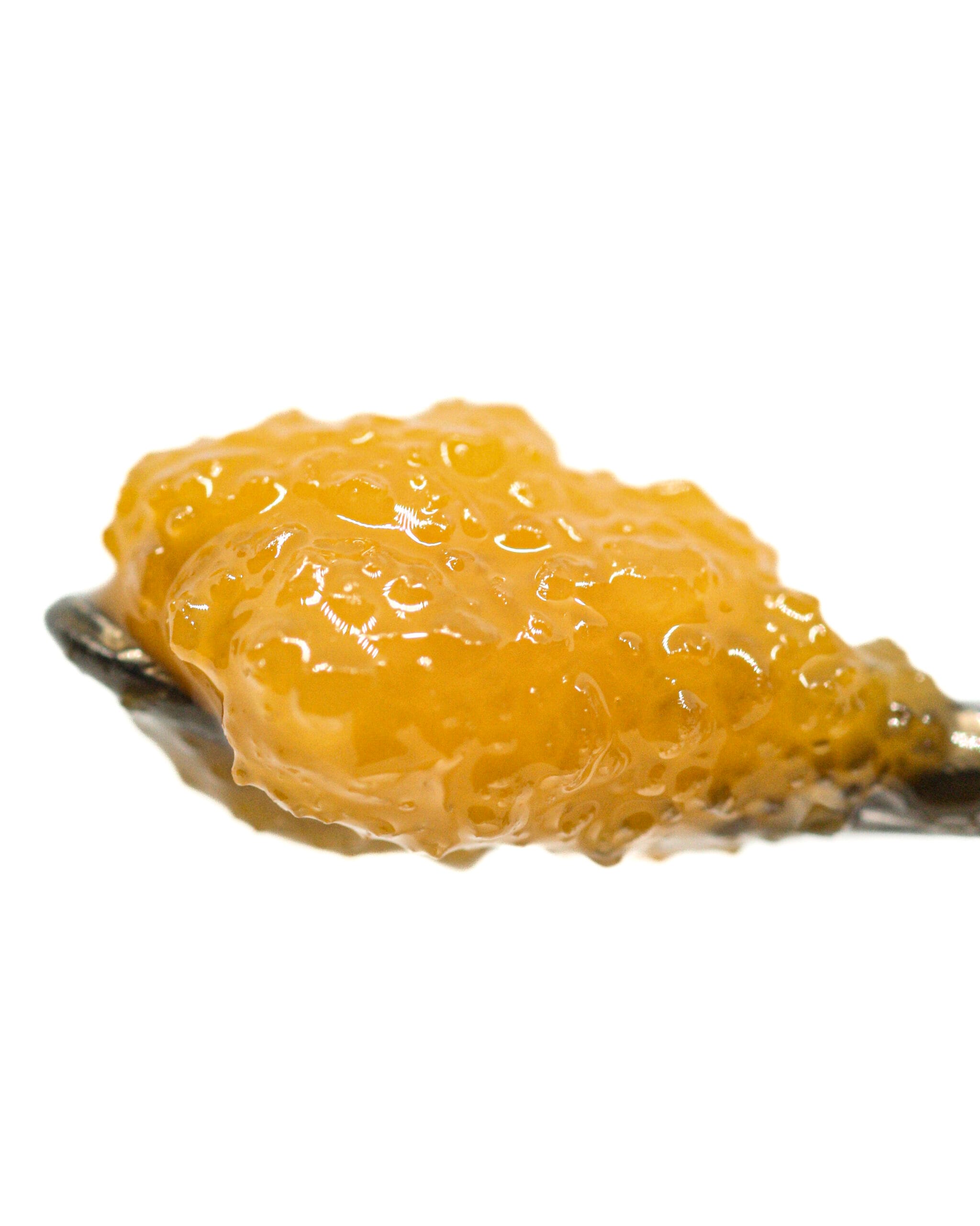 Golden to light amber concentrate with a glossy, slightly saucy consistency. Clean and terpene-rich with an active, oily surface.
