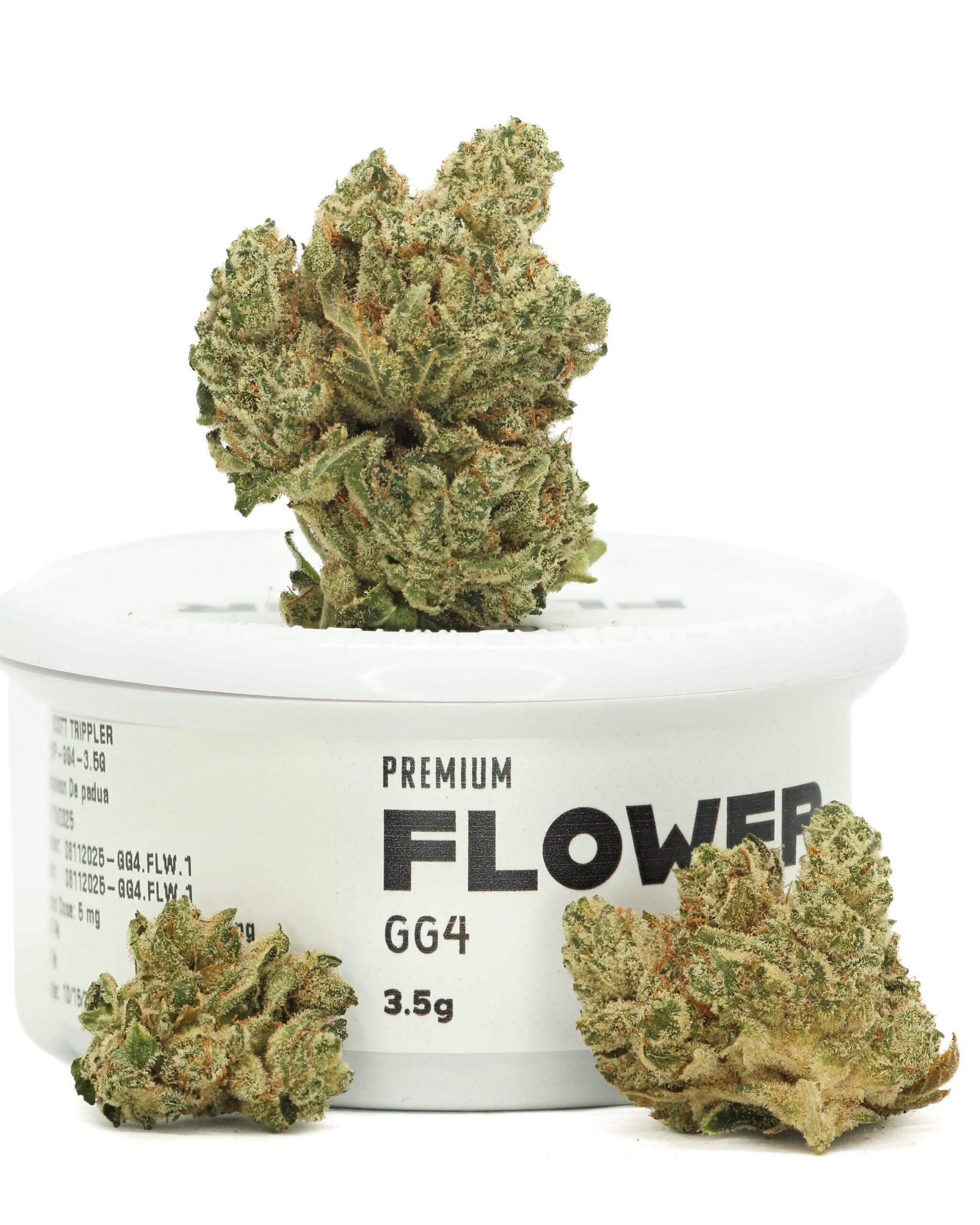 Dense, chunky buds with heavy trichome coverage. Deep green flower with amber hairs, showing a sticky, resin-rich cure typical of GG4.