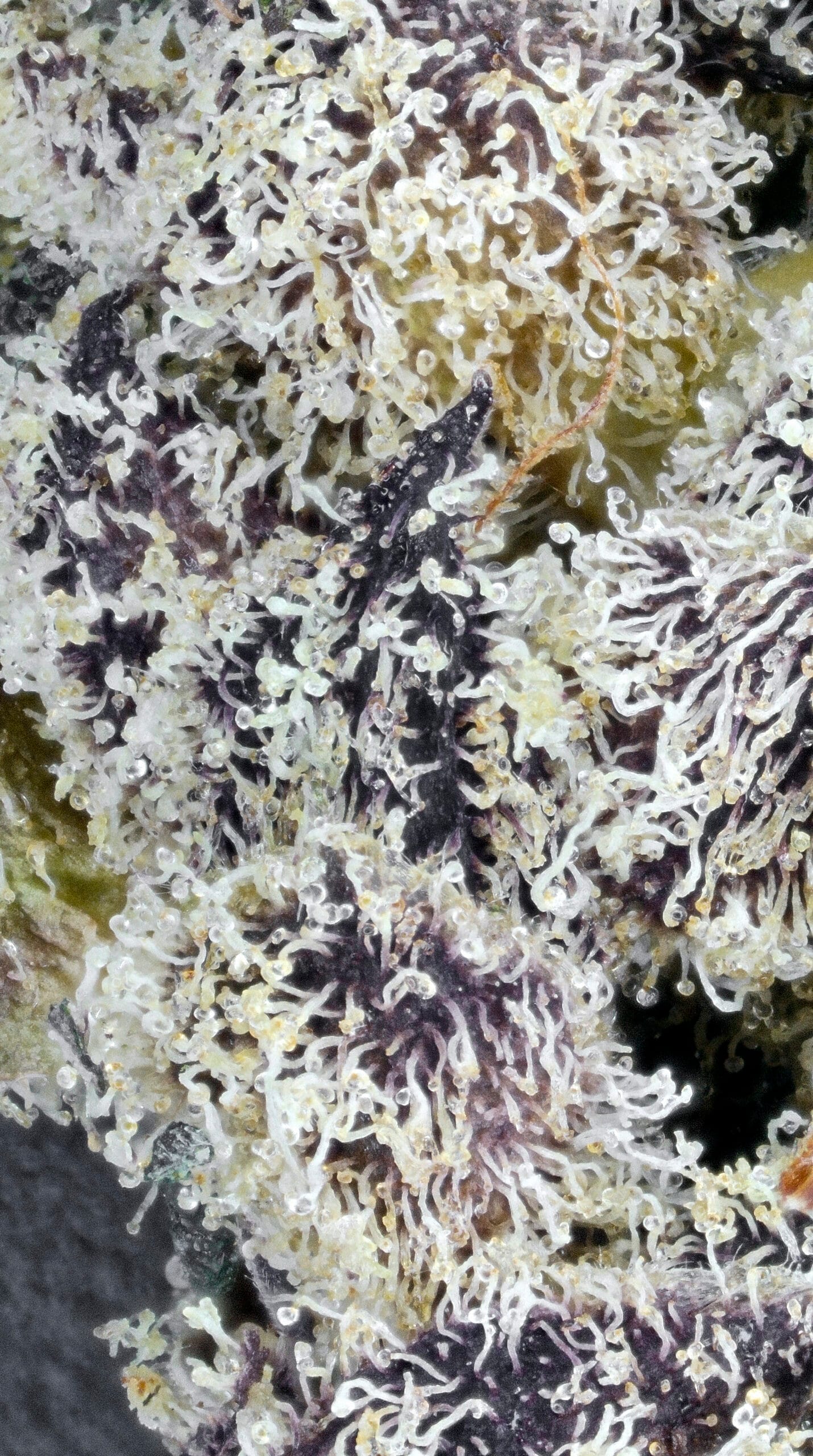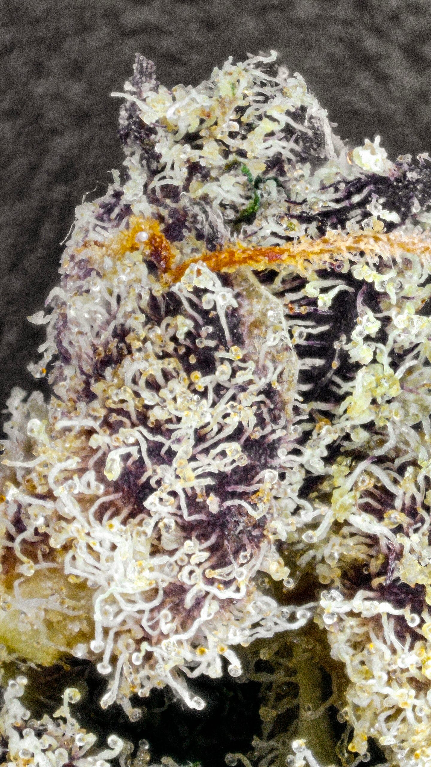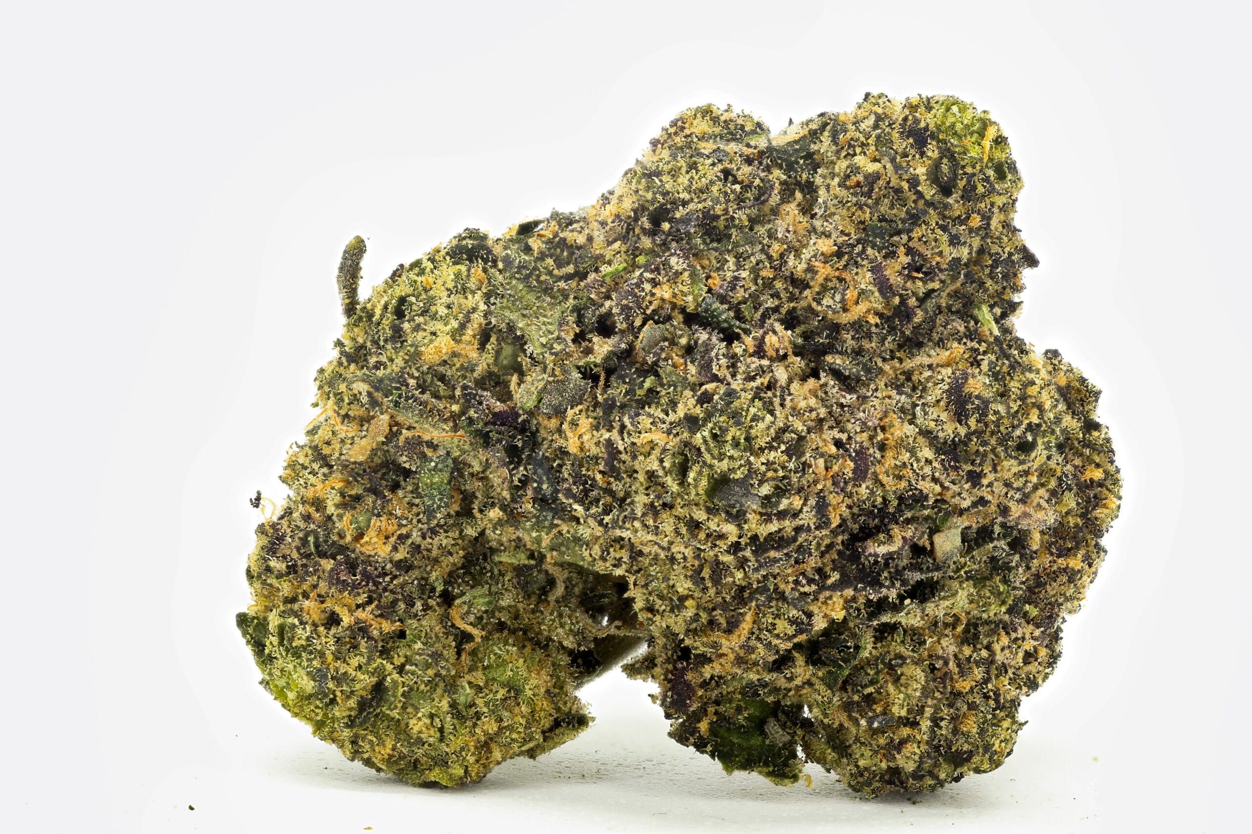 Dense, resinous nugs showcase deep purple tones contrasted by deep green and vibrant orange hairs. Trichome coverage is thick and glistening—visually striking and indicative of high cannabinoid content.