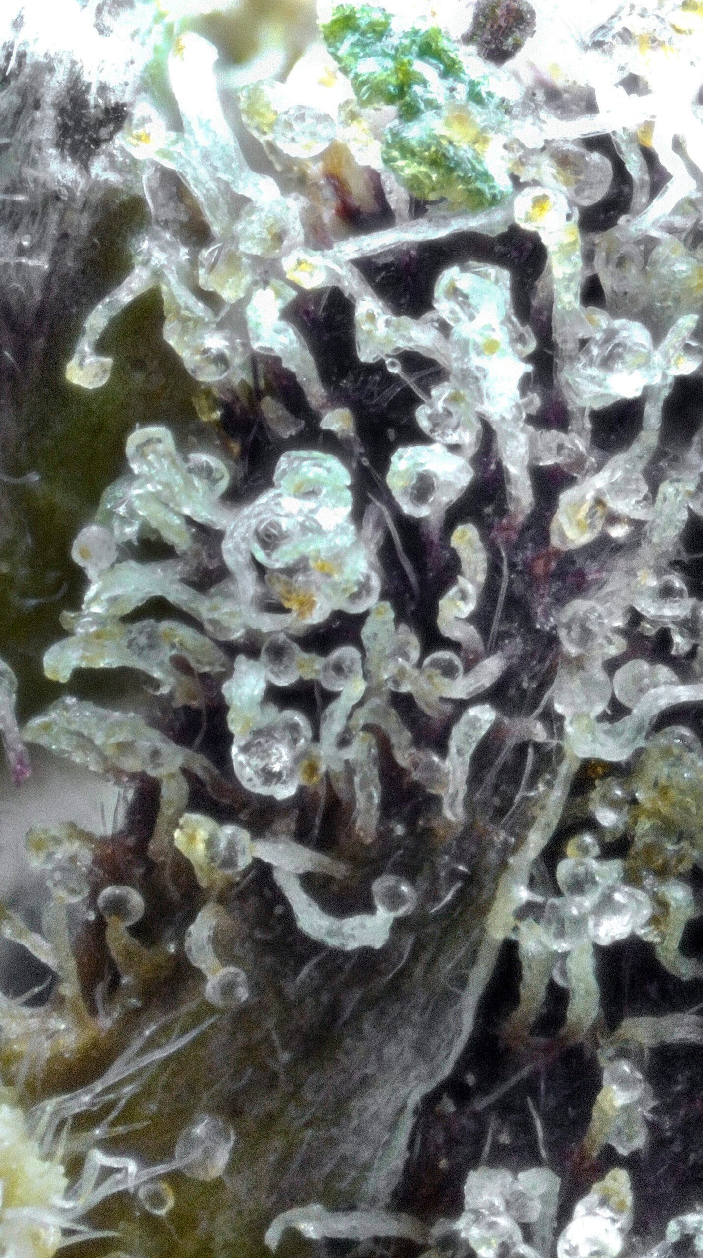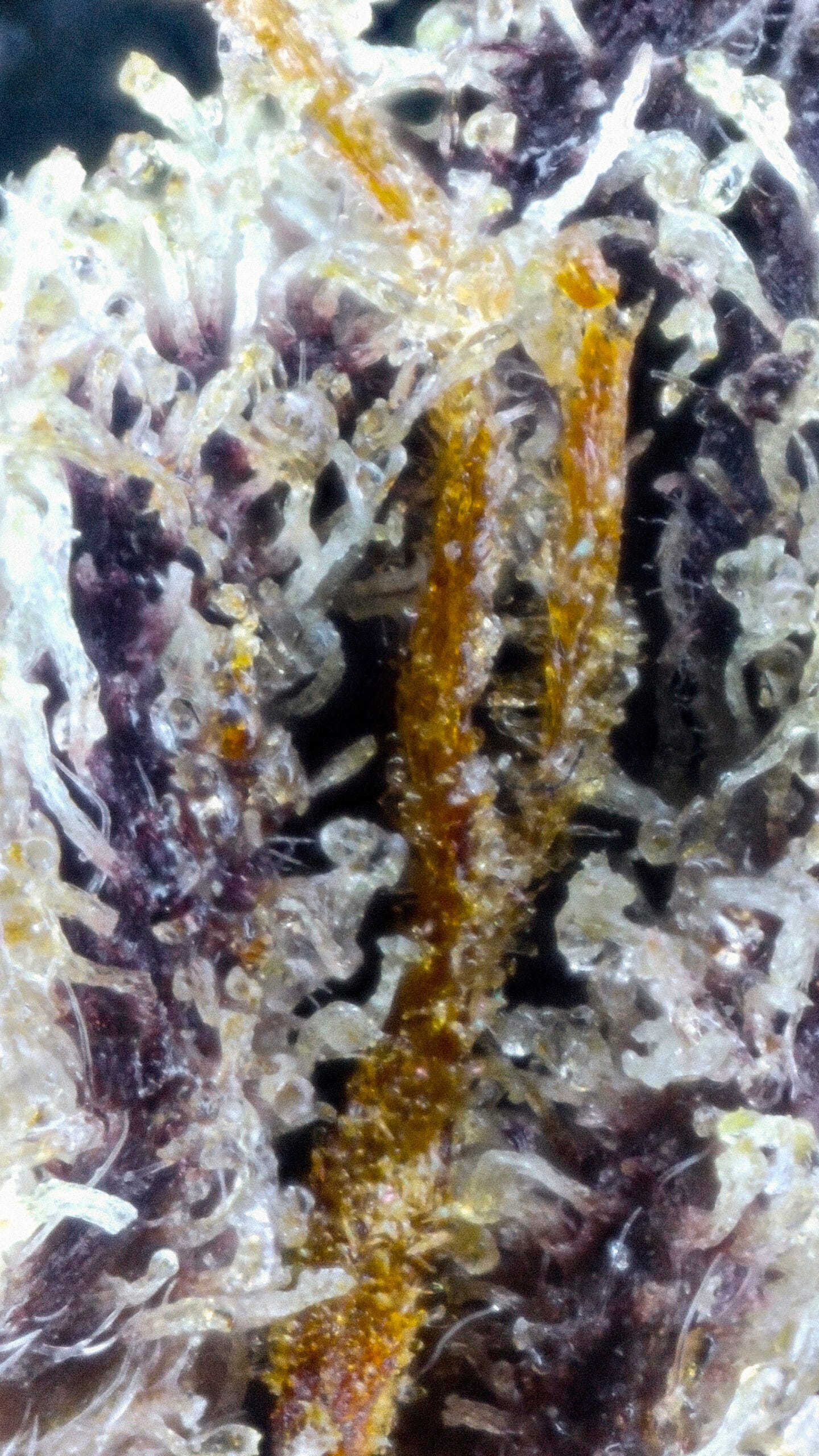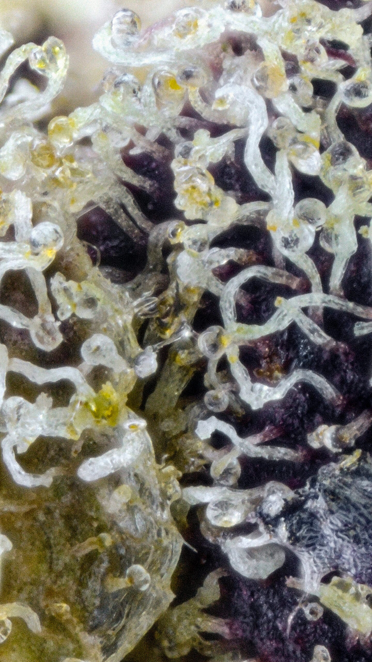 Dense, resinous nugs showcase deep purple tones contrasted by deep green and vibrant orange hairs. Trichome coverage is thick and glistening—visually striking and indicative of high cannabinoid content.