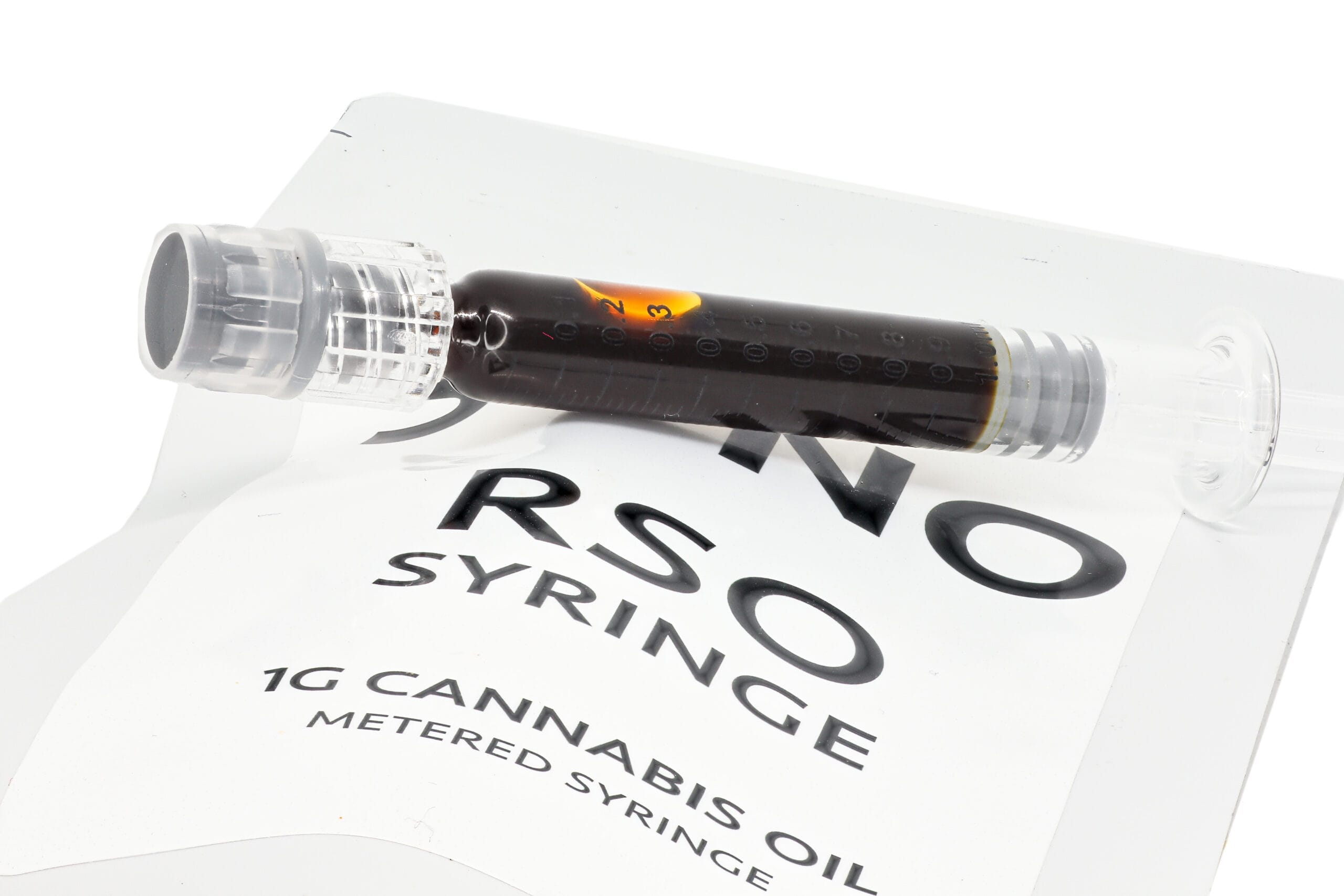 A thick, dark amber-brown resin with a sticky, viscous texture. Its consistency is dense and smooth—typical of high-grade black label RSO preparations.