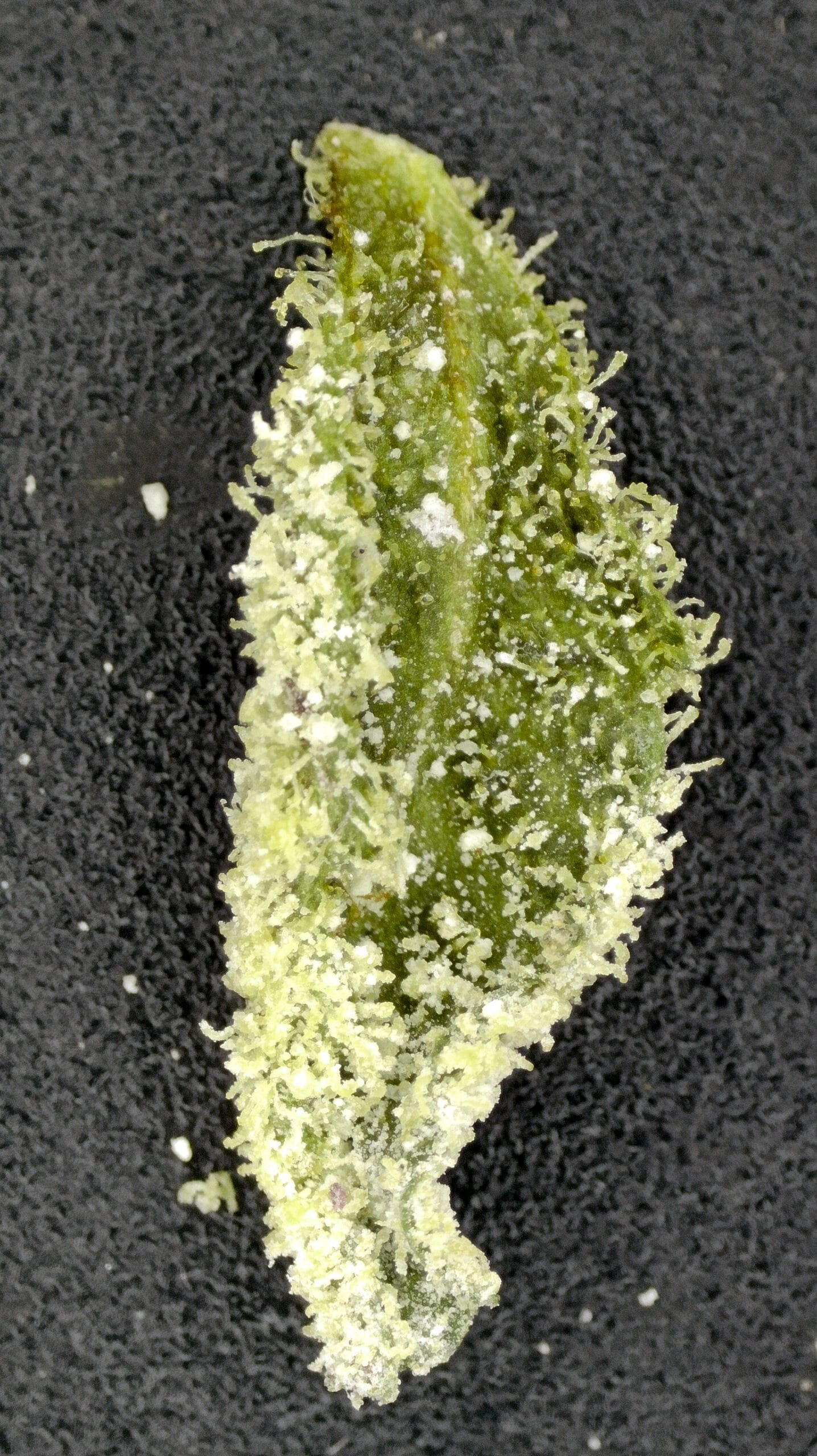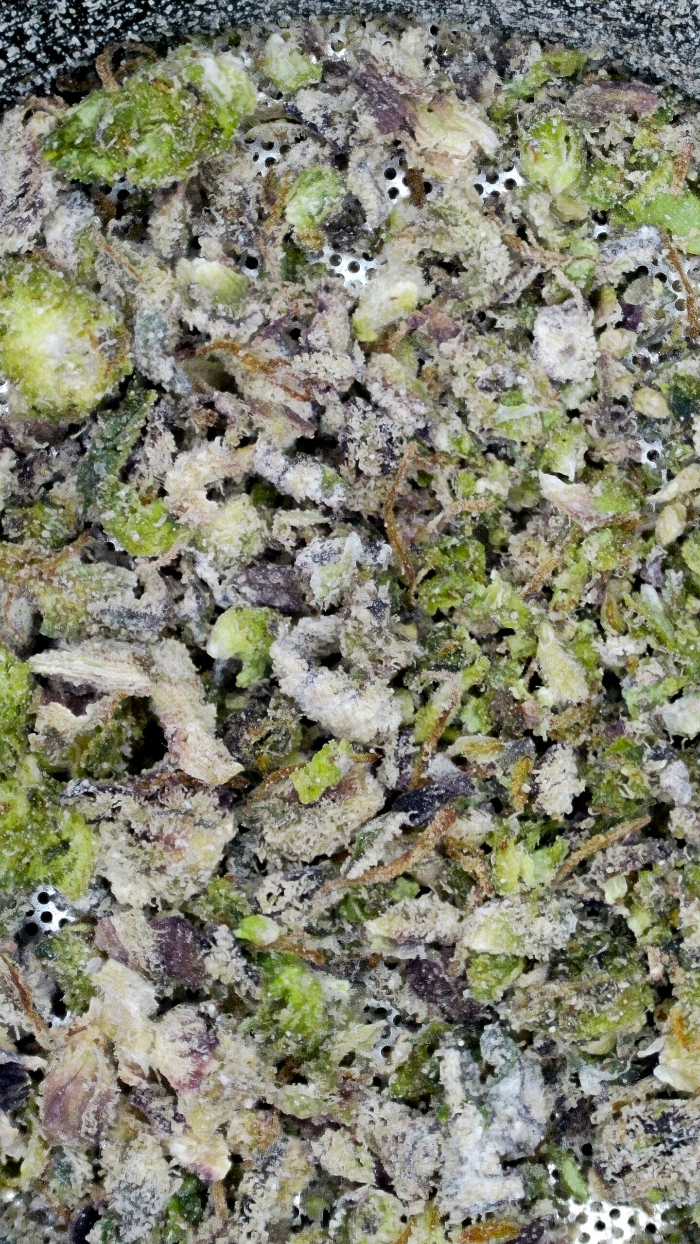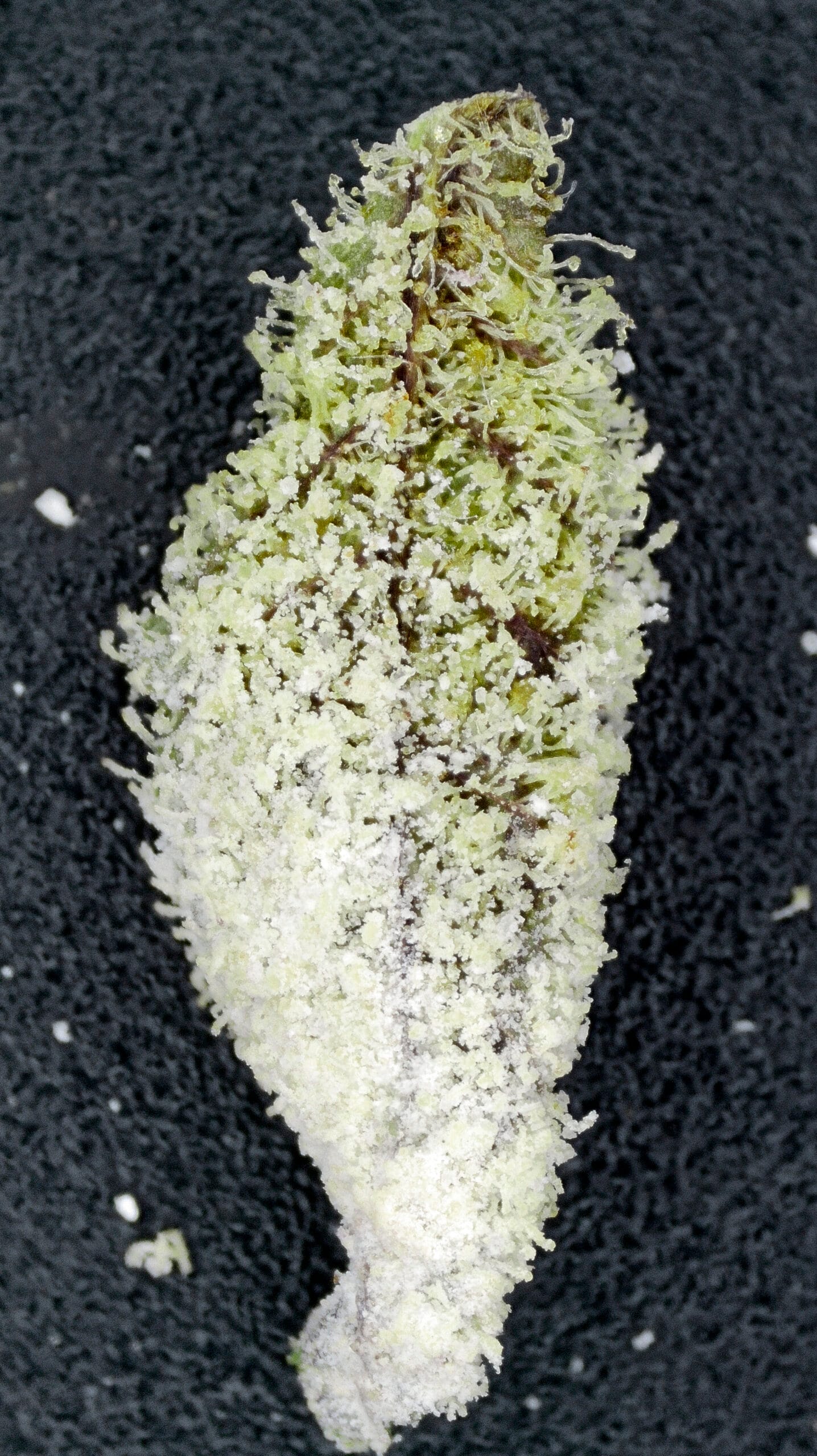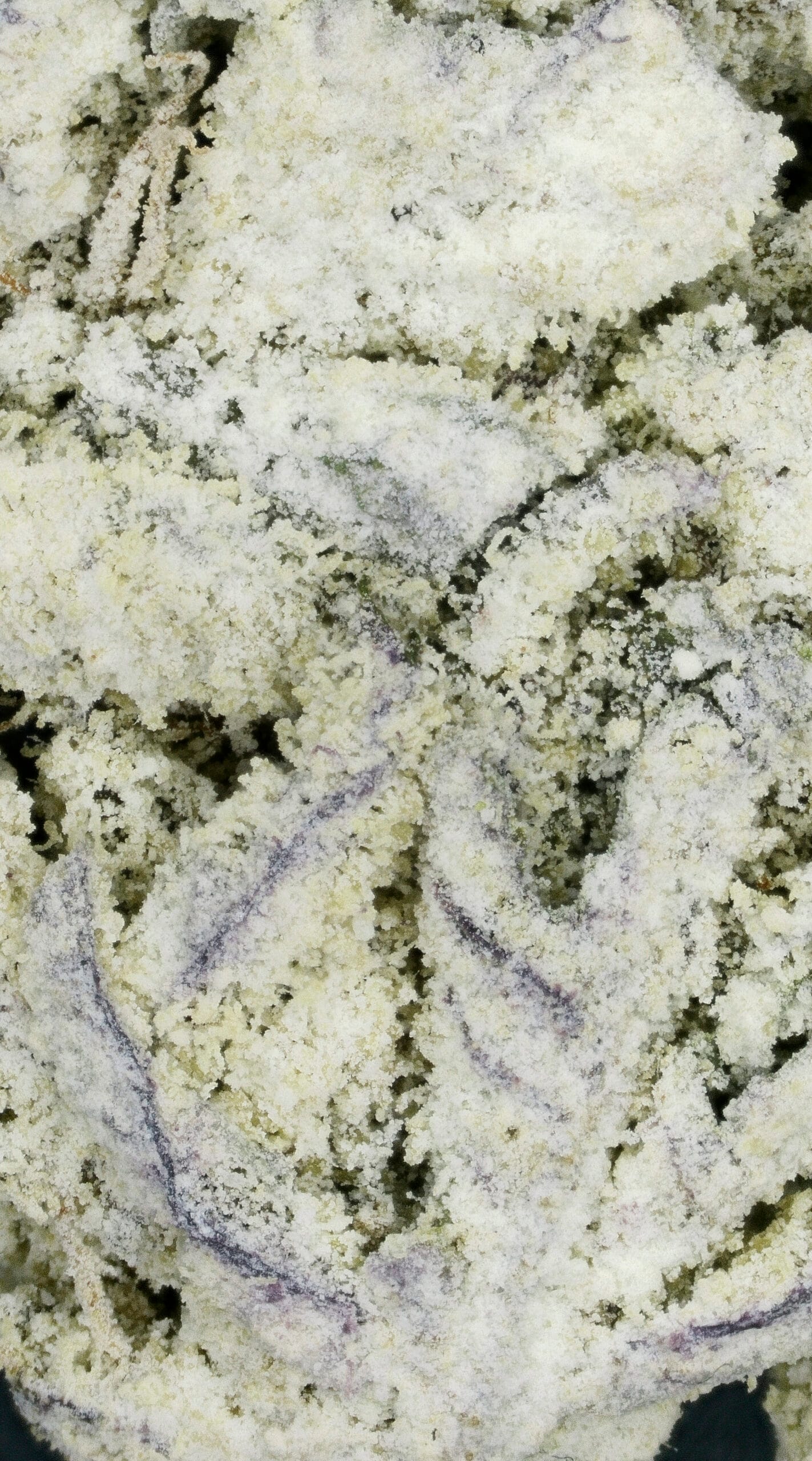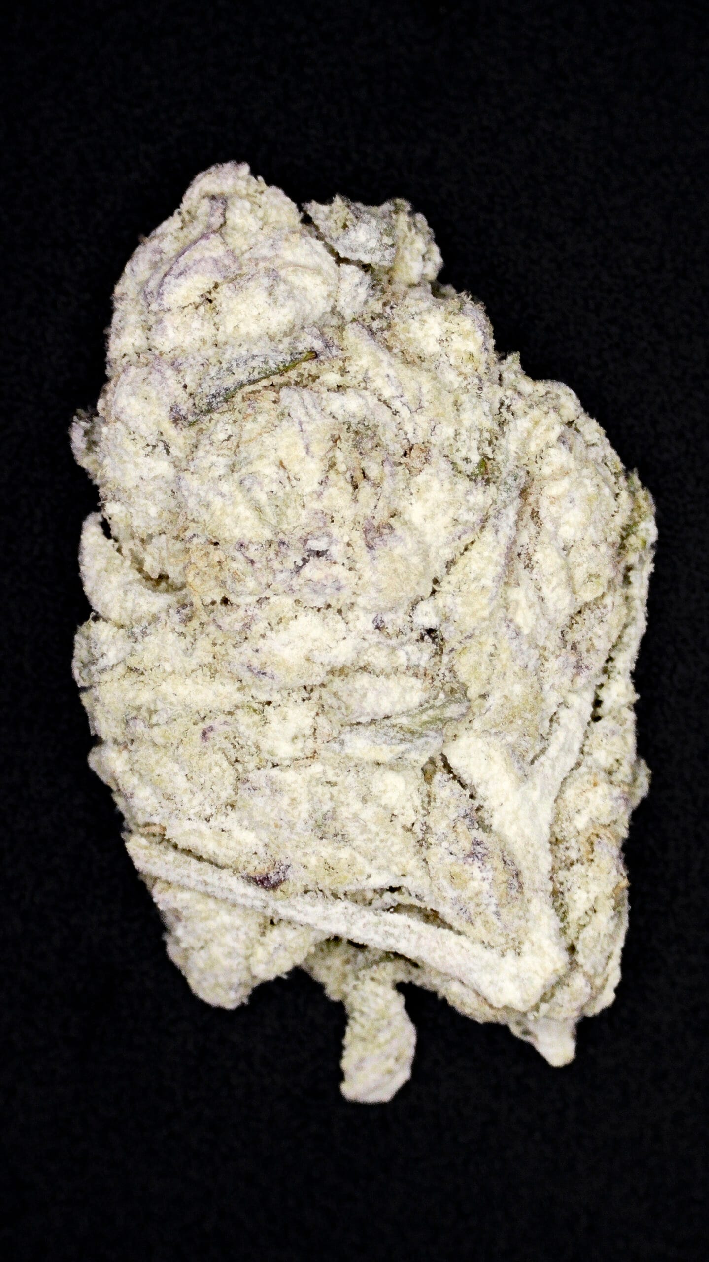 Thick, snow-dusted buds with a rich forest green base. Complete heavy trichome coverage gave it the fitting name “Snow Caps.” Medium-sized nugs with tightly packed calyxes and occasional deep amber pistils added contrast and structure.