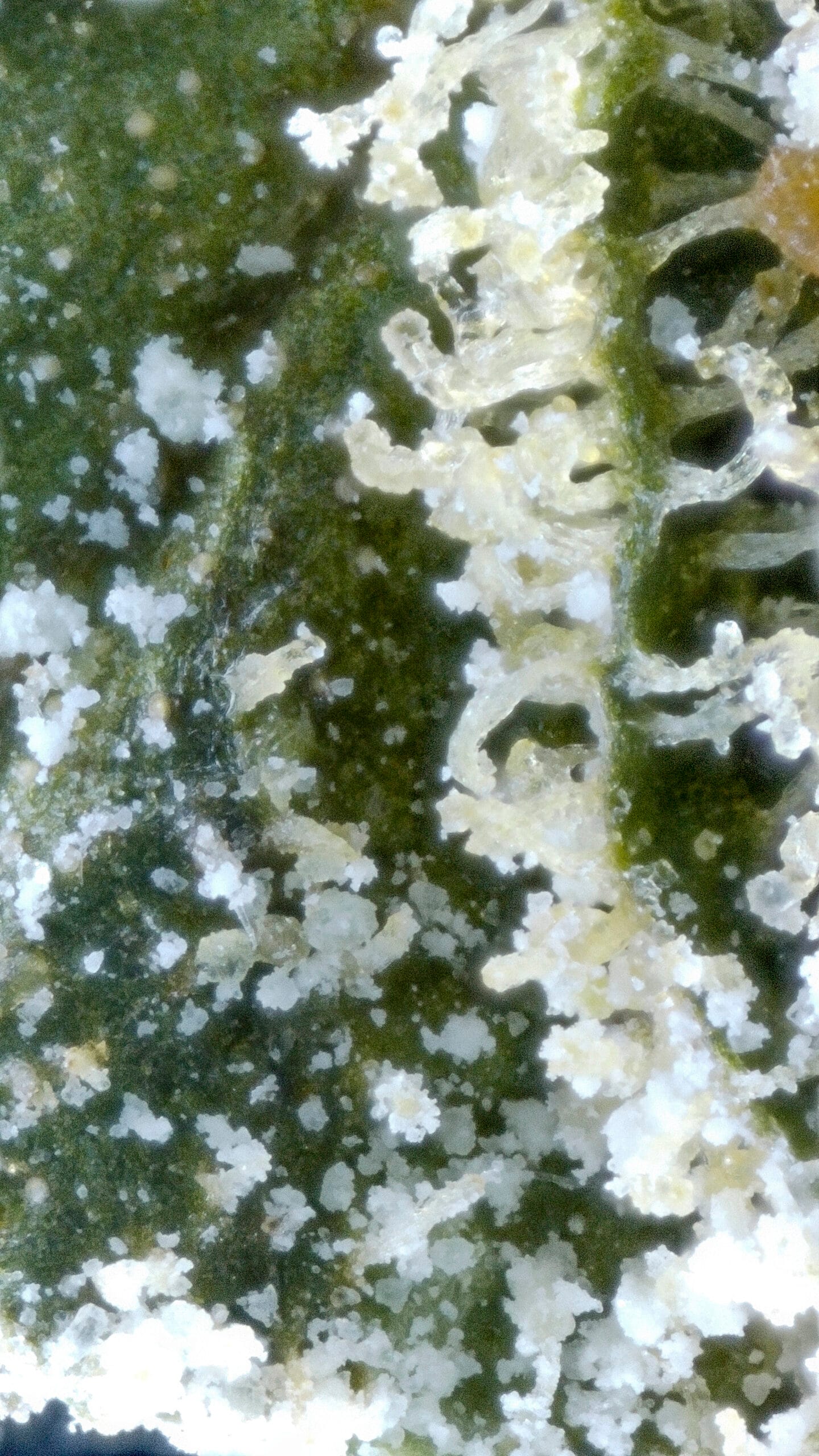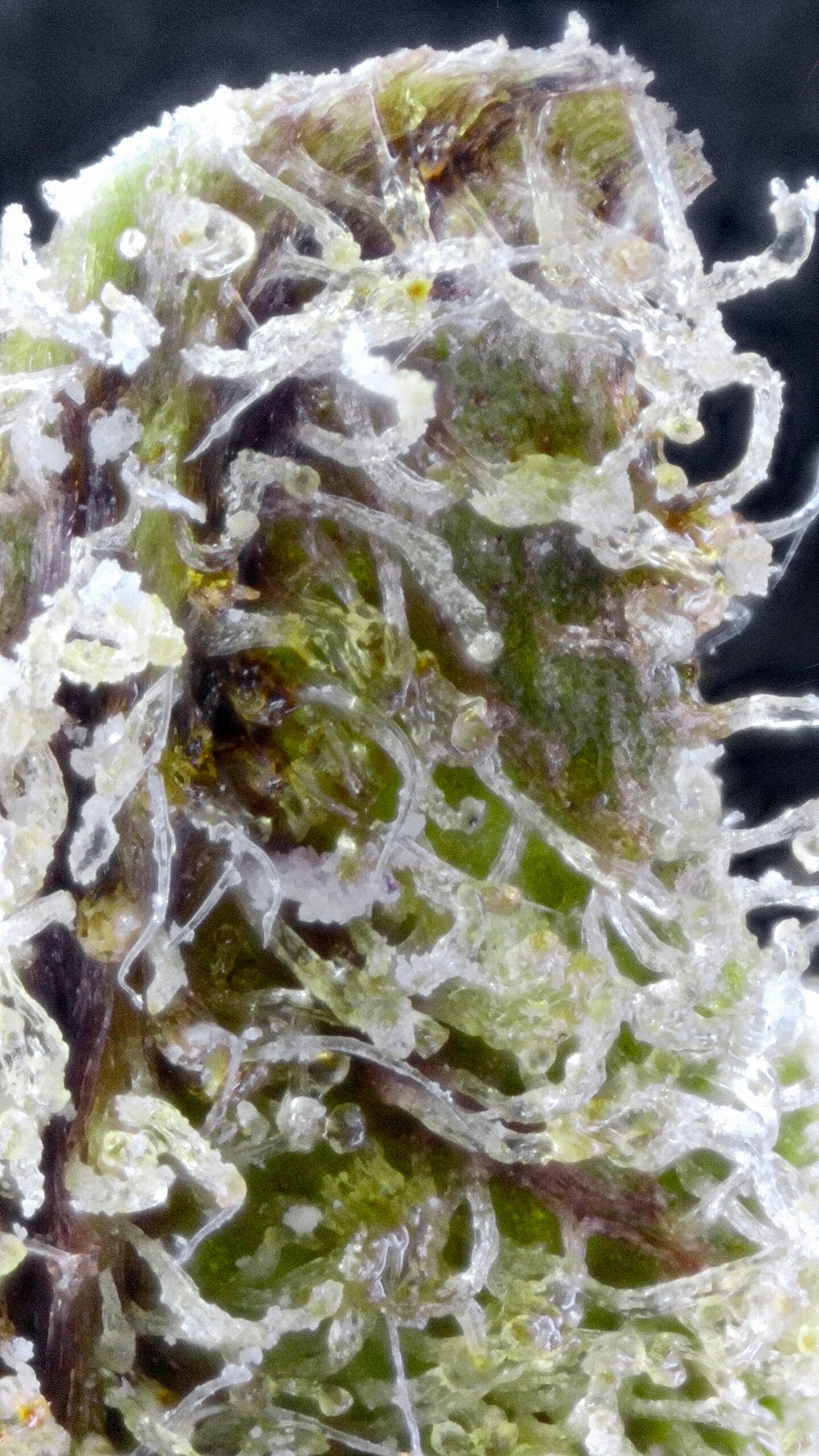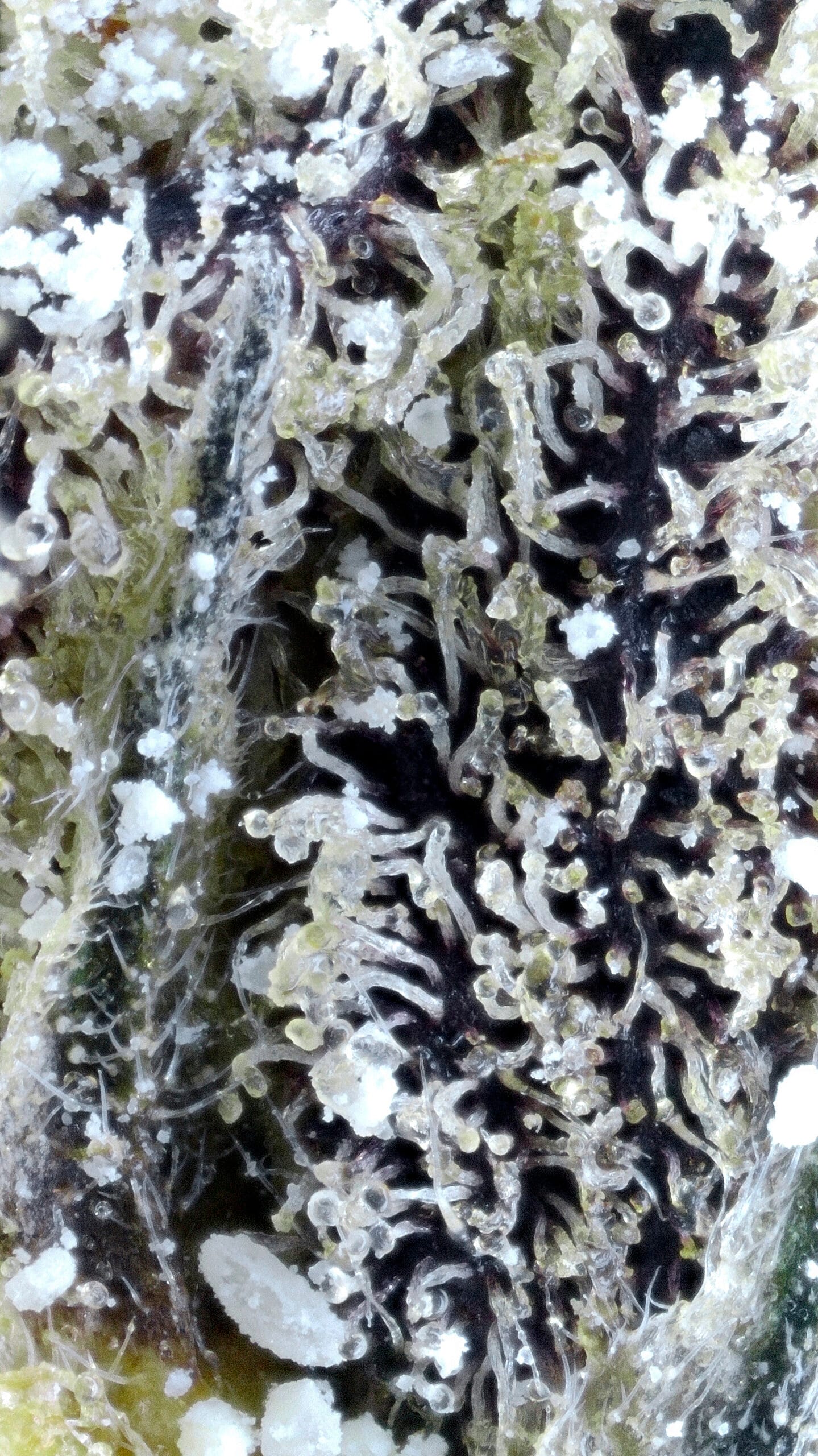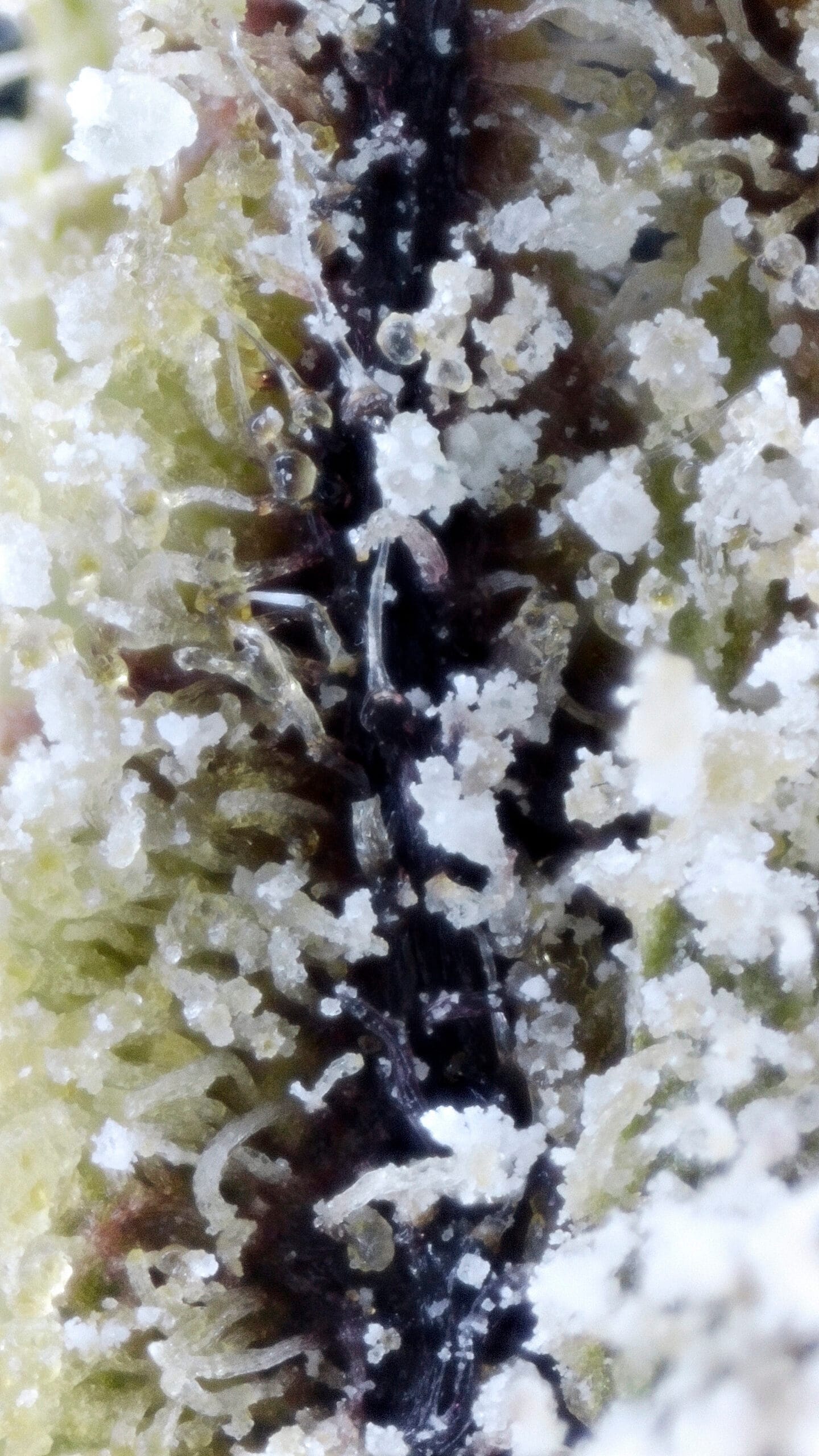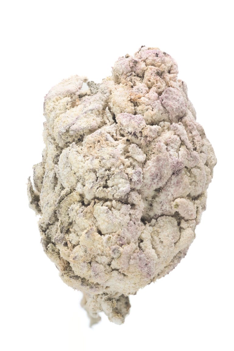 Thick, snow-dusted buds with a rich forest green base. Complete heavy trichome coverage gave it the fitting name “Snow Caps.” Medium-sized nugs with tightly packed calyxes and occasional deep amber pistils added contrast and structure.