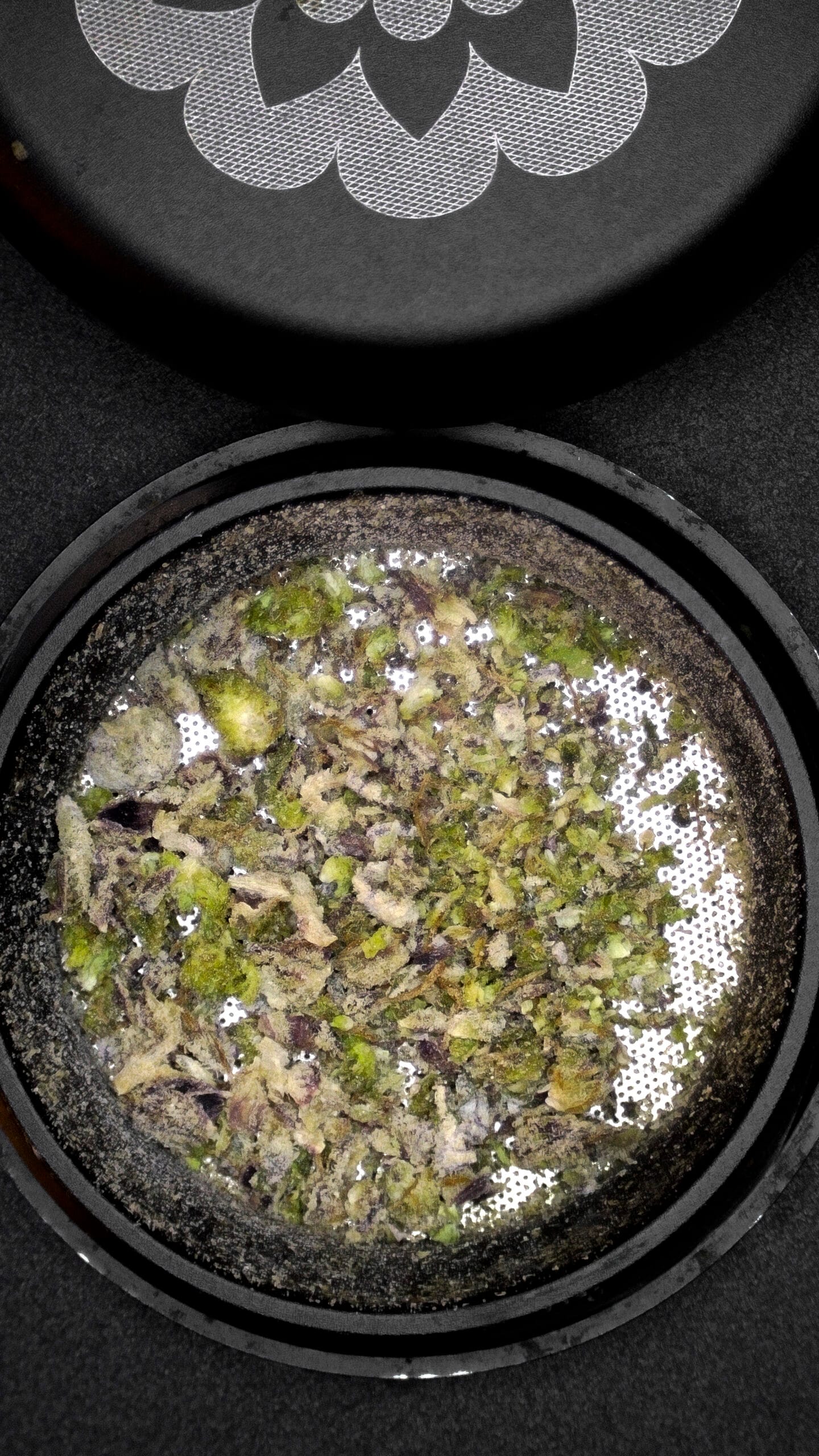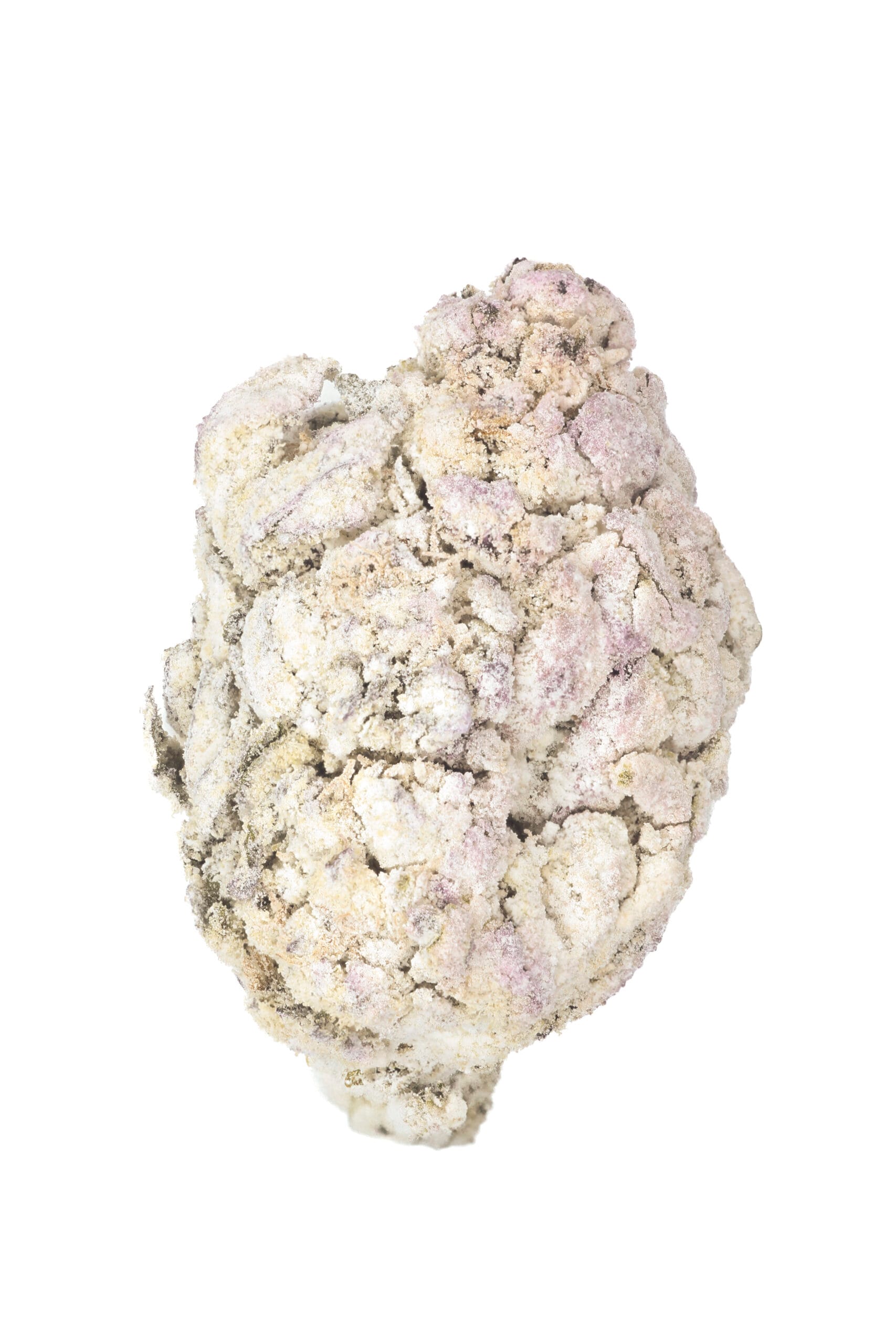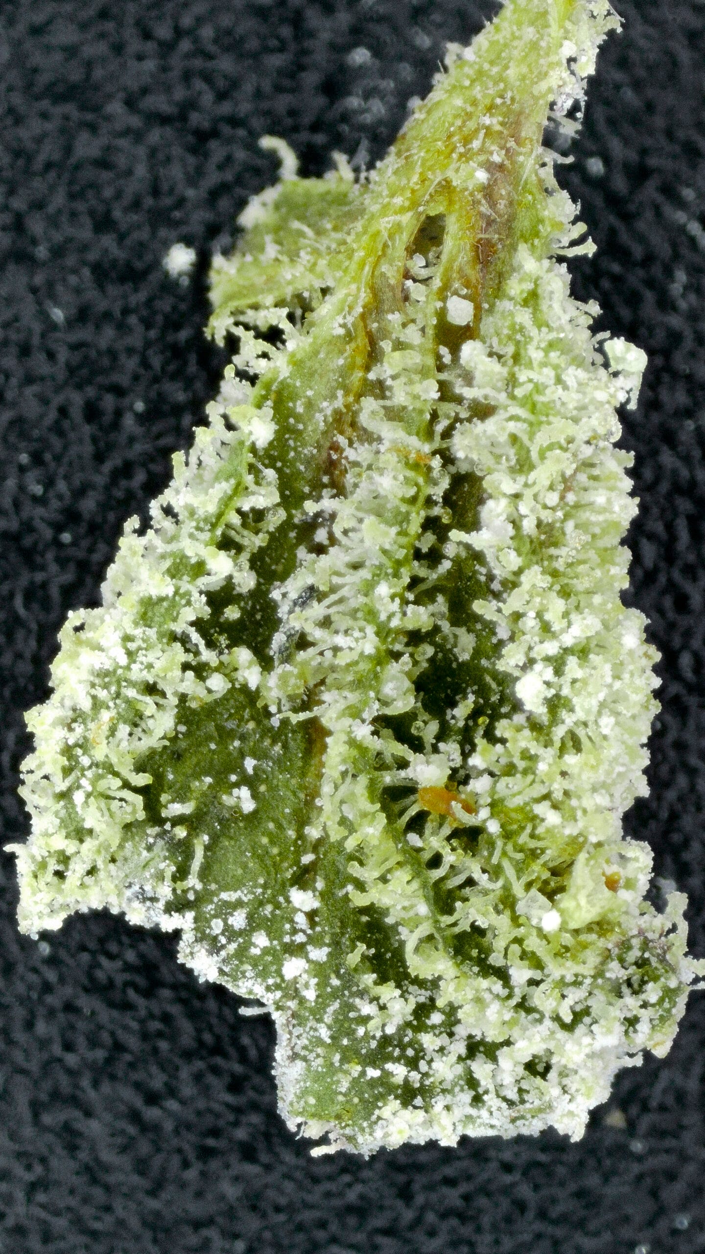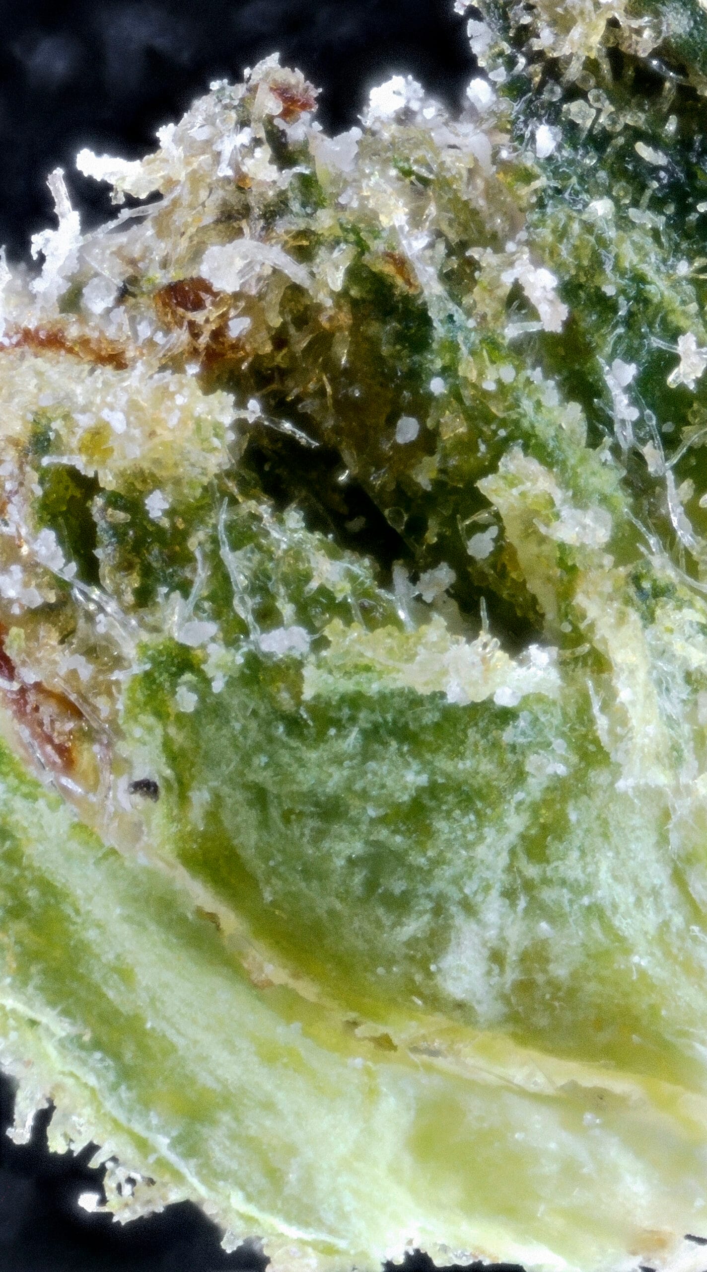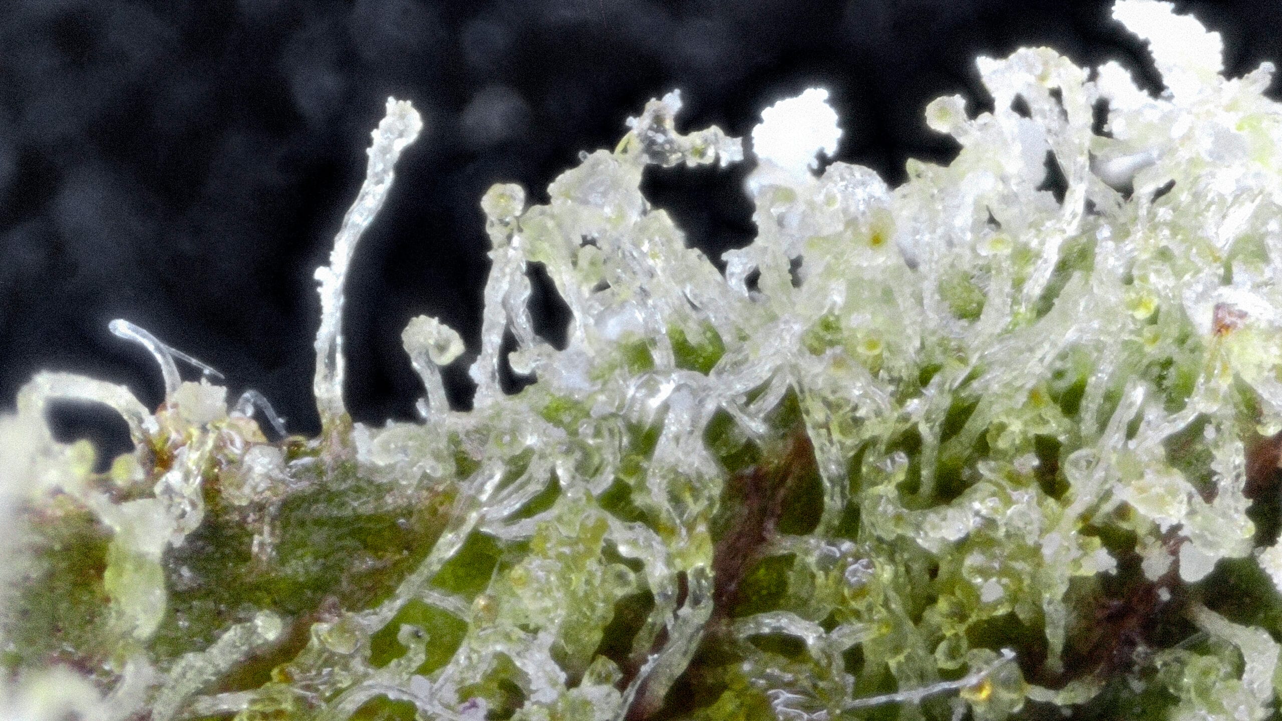 Thick, snow-dusted buds with a rich forest green base. Complete heavy trichome coverage gave it the fitting name “Snow Caps.” Medium-sized nugs with tightly packed calyxes and occasional deep amber pistils added contrast and structure.