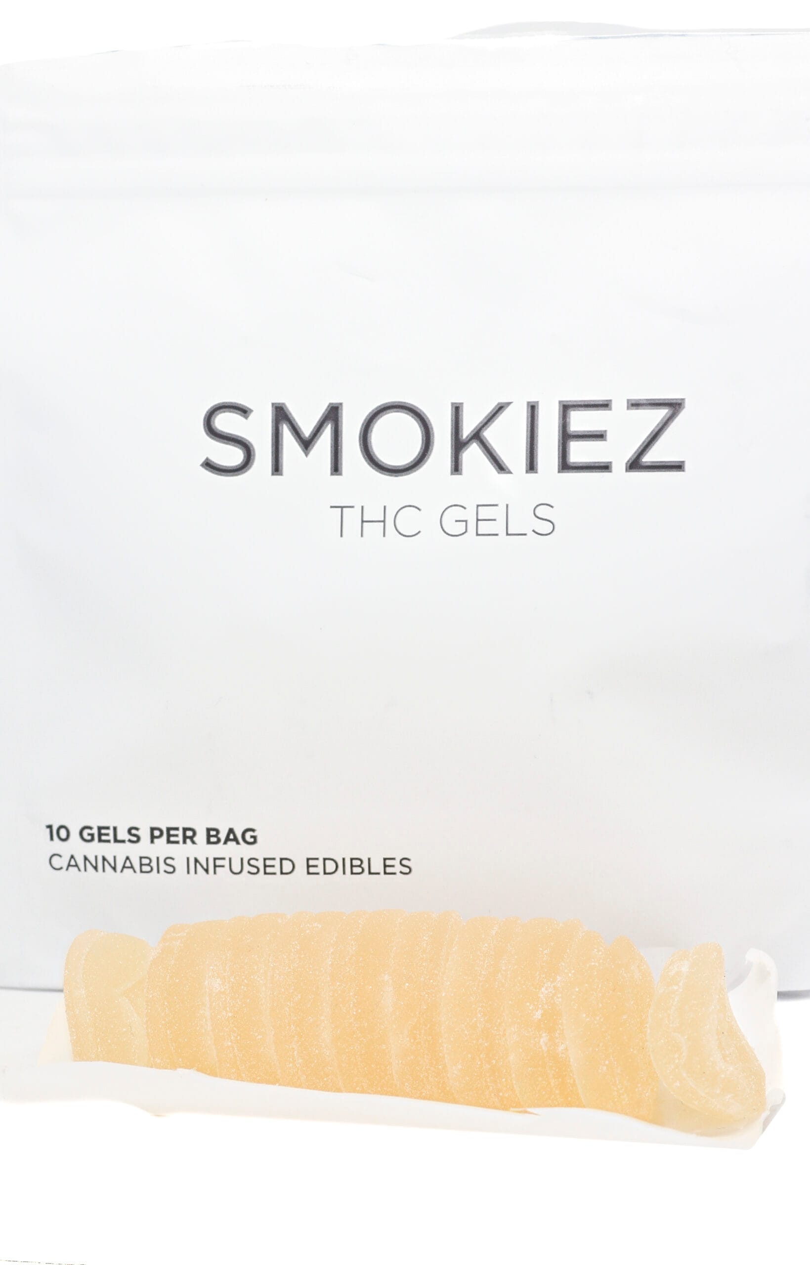 Sour Blue Raspberry Smokiez Gels are small, translucent gel candies with a light gold hue. Each piece is uniformly shaped and sized, making dosing simple and consistent. The packaging clearly indicates serving size and total THC content.