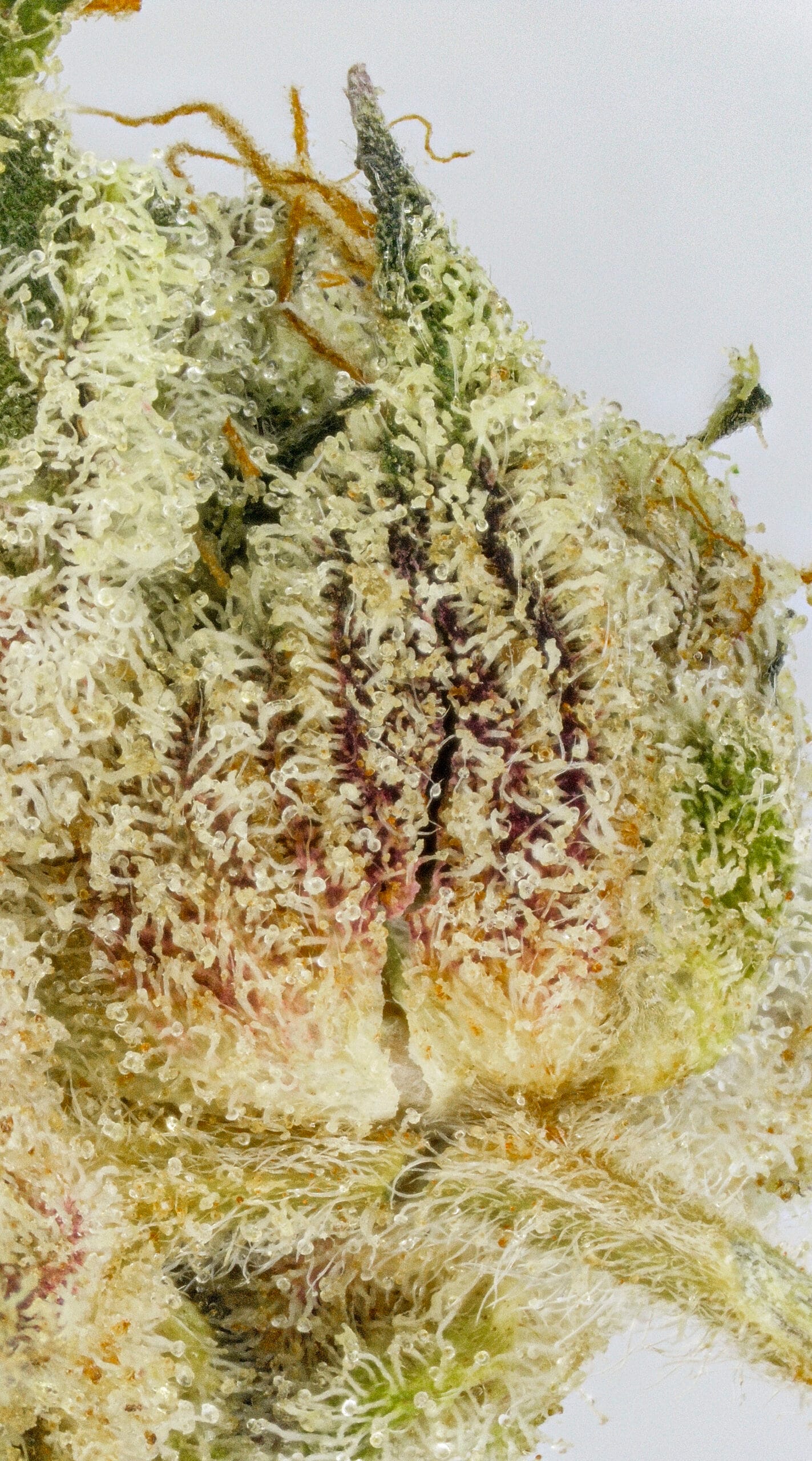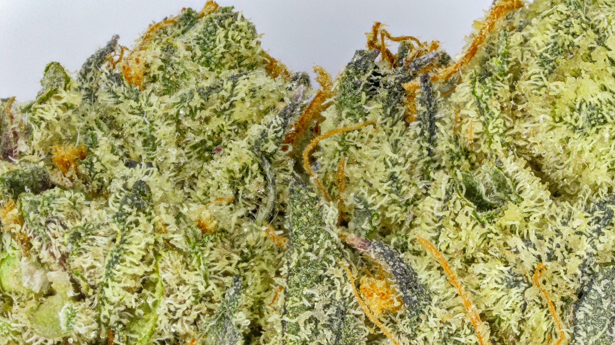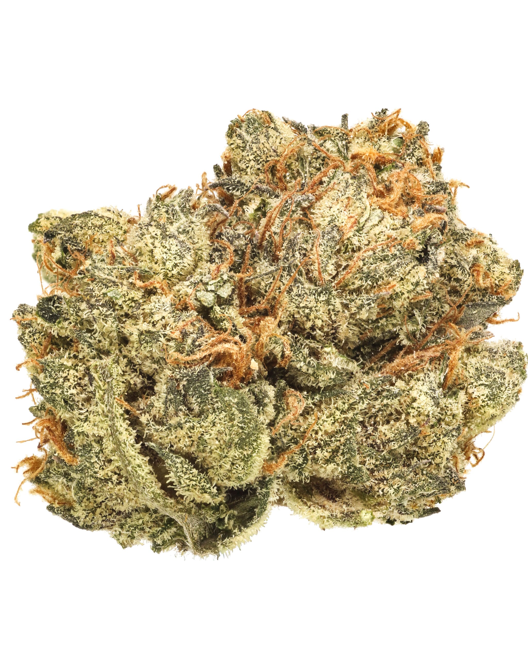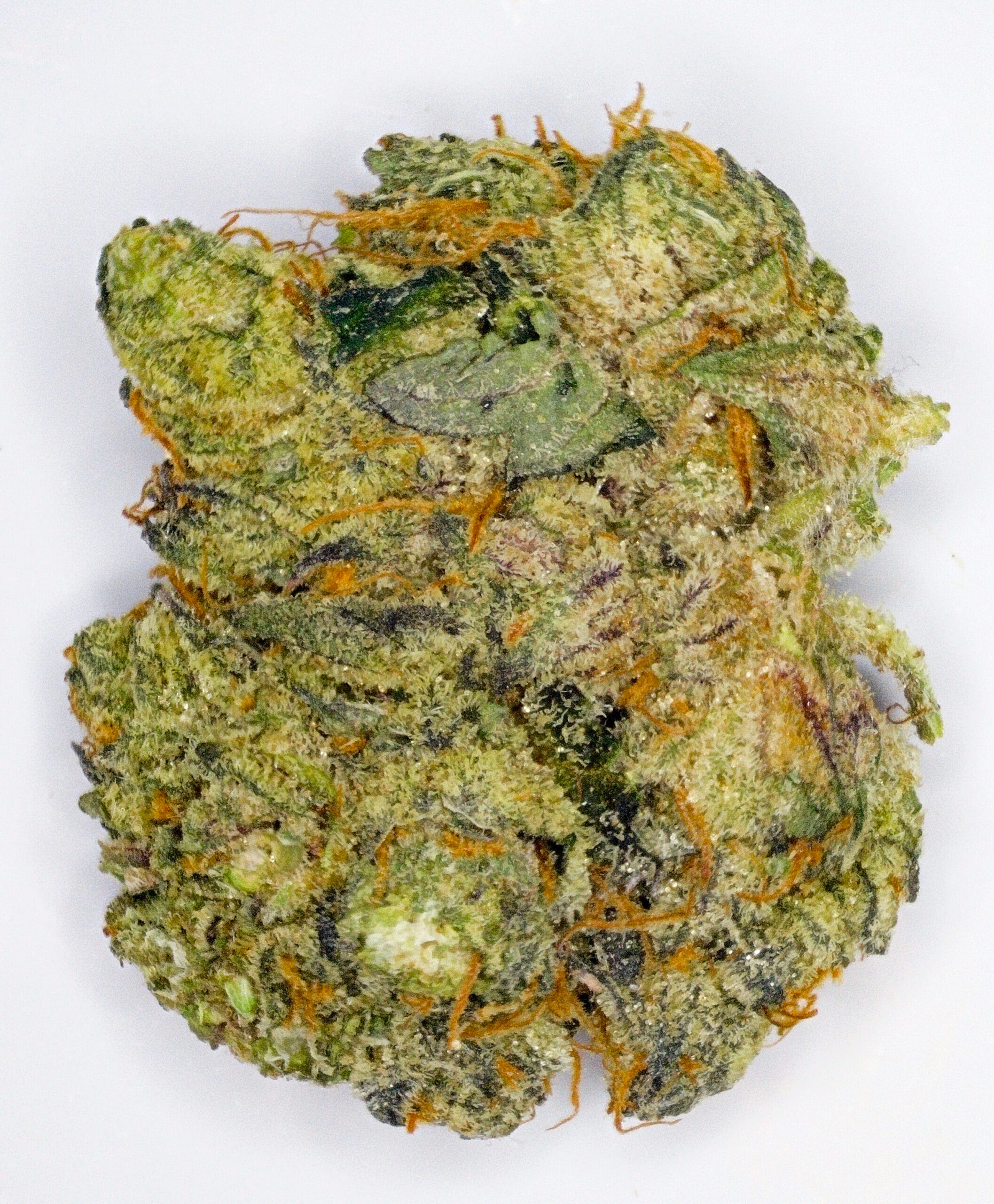 The Creamery showcases dense, frosty buds with a soft green base and subtle purple hues. Amber pistils and a generous trichome coating give it a slightly glossy, dessert-inspired look that matches its flavor profile.