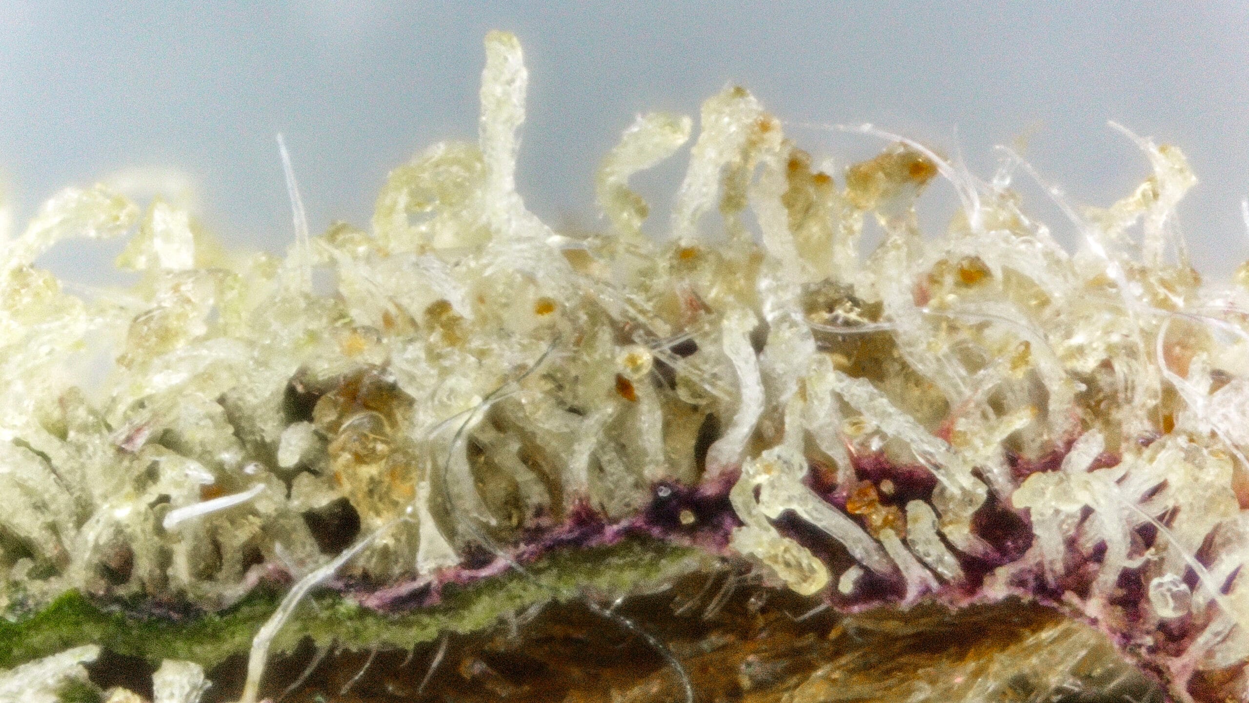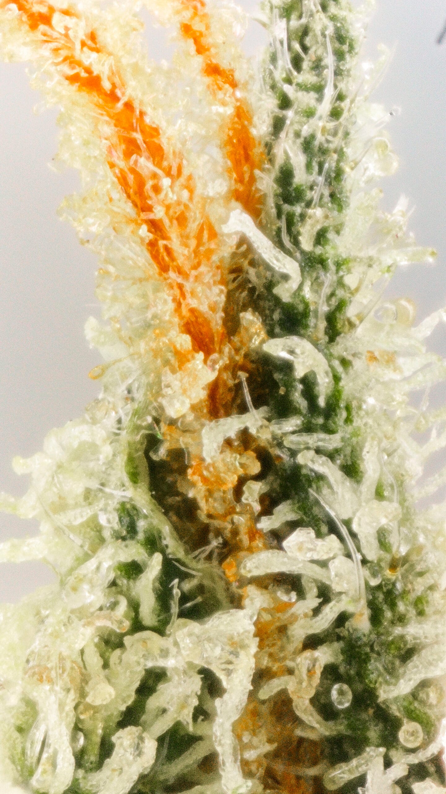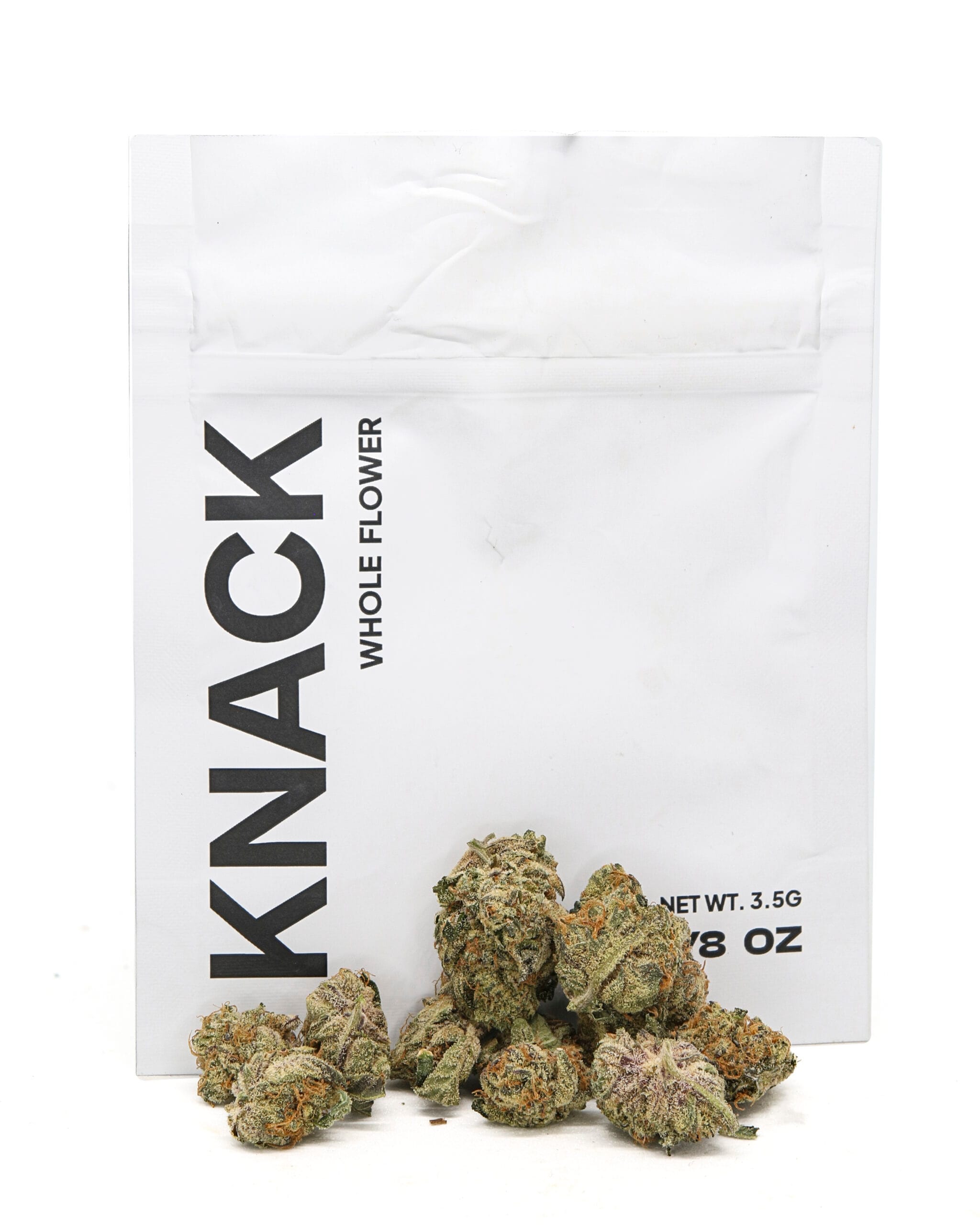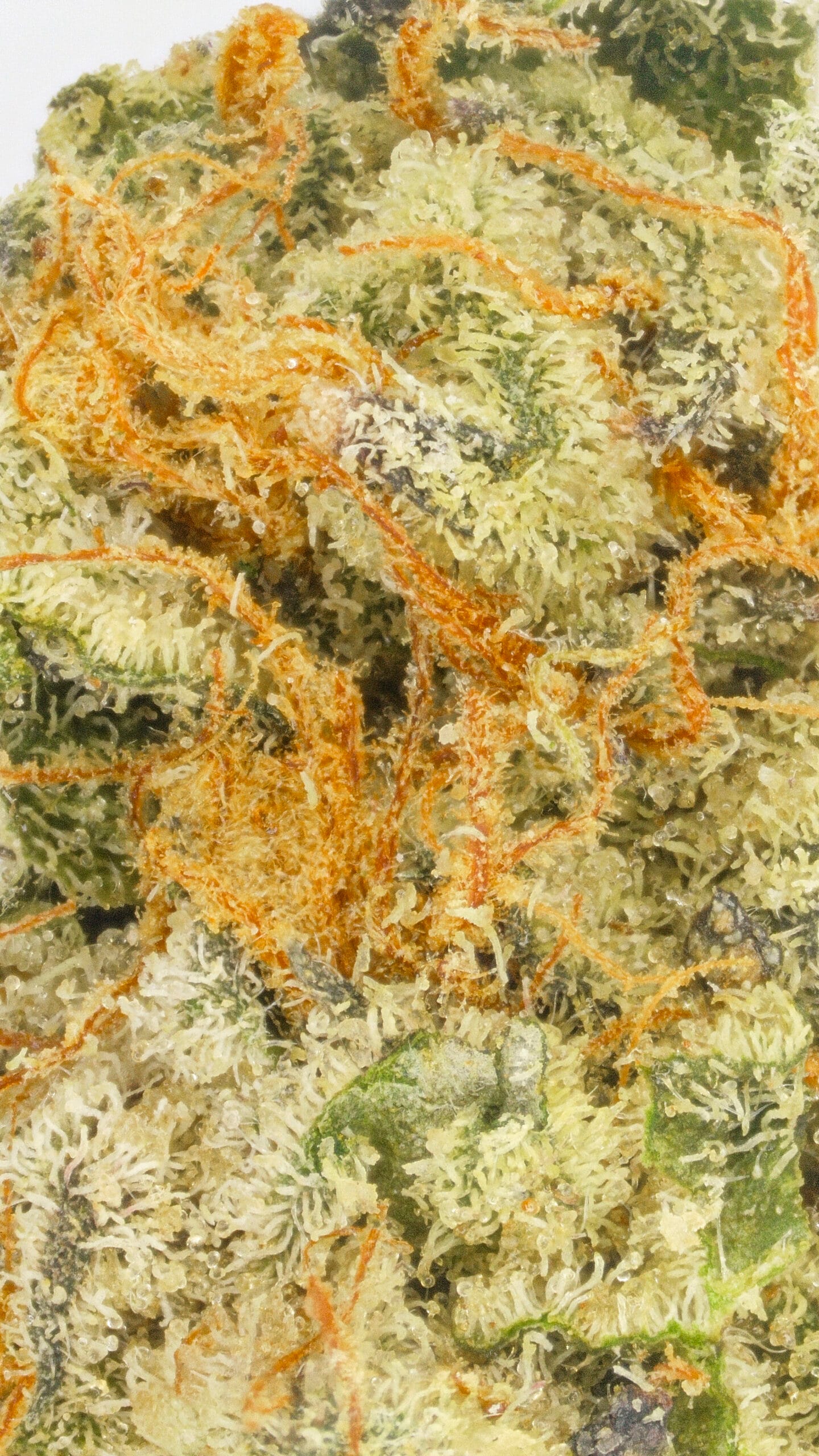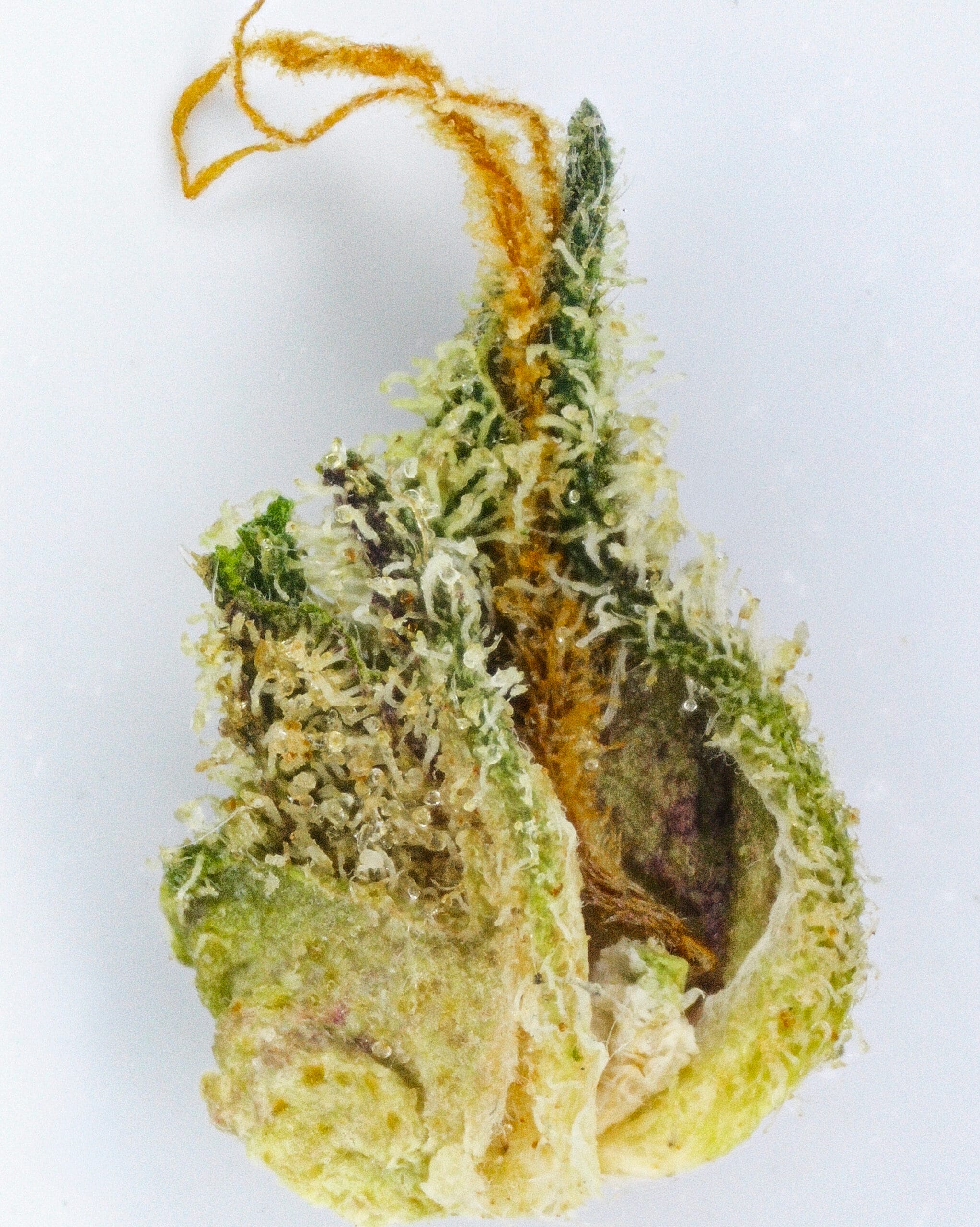 The Creamery showcases dense, frosty buds with a soft green base and subtle purple hues. Amber pistils and a generous trichome coating give it a slightly glossy, dessert-inspired look that matches its flavor profile.
