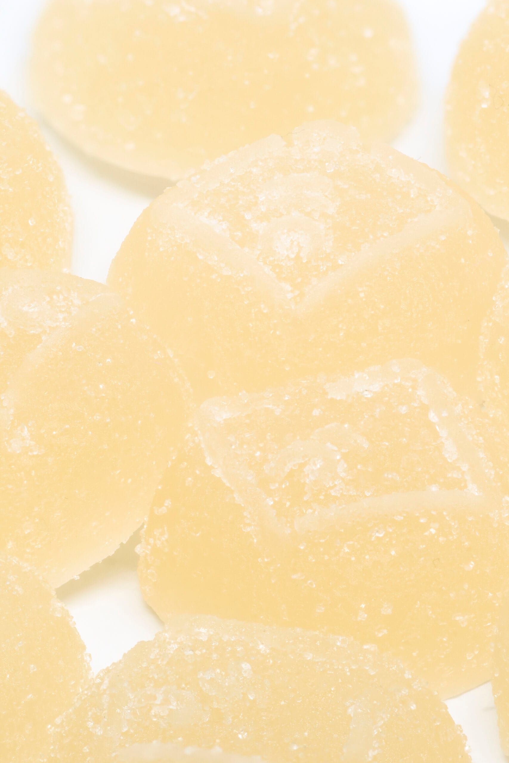 Bright yellow gummies with a smooth, consistent finish. Slightly translucent with a soft, chewy texture that holds its shape—classic premium edible look.